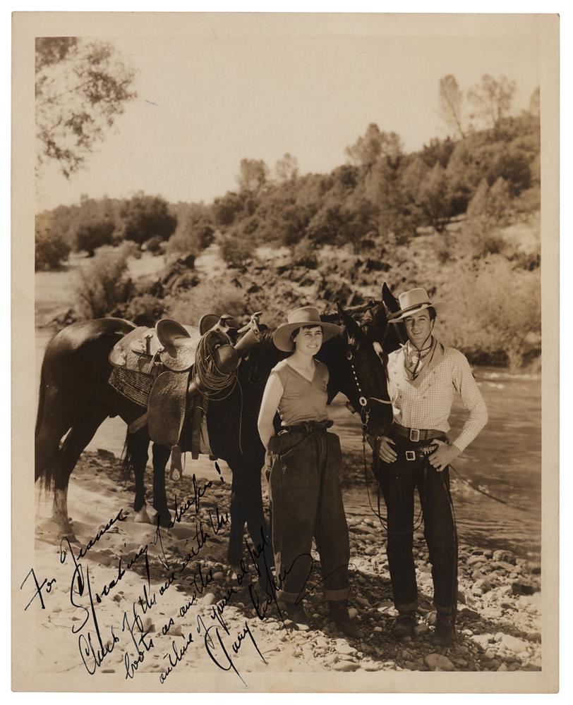 Great vintage matte-finish 8 x 10 photo of Cooper in cowboy gear alongside a trusty steed, signed and inscribed in fountain pen, "To Jeanne?Check off the one with the boots as another outline of your ol' pal, Gary Cooper.” In very fine condition.