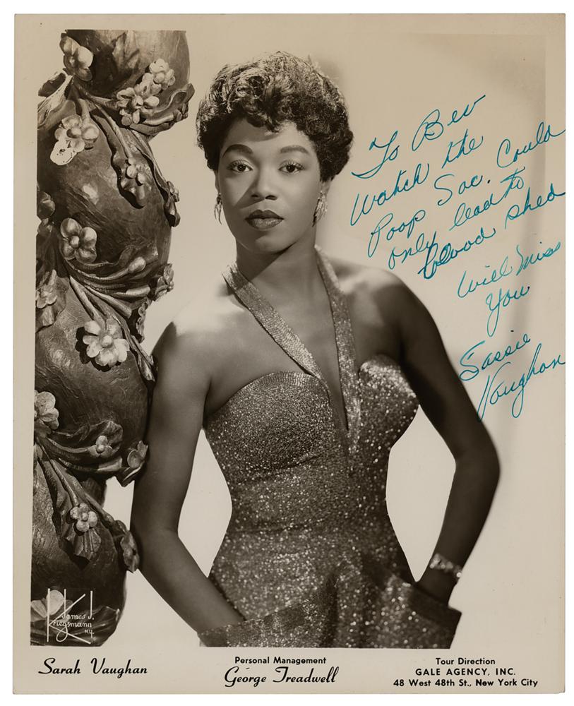 Vintage glossy 8 x 10 publicity photo of Sarah Vaughan by James J. Kriegsmann of New York, signed and inscribed in blue fountain pen, "To Bev, Watch the Poop Sac. Could only lead to blood shed. Will miss you. Sassie Vaughan.” In fine condition, with scattered light creasing.