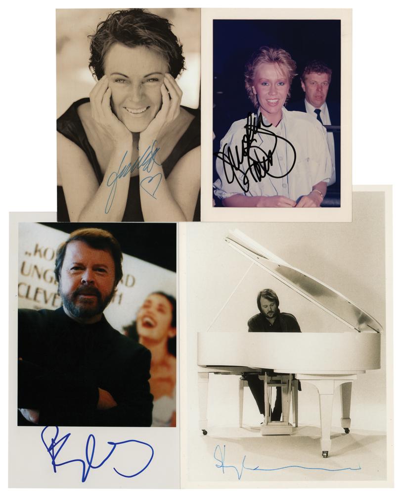 Four glossy and semi-glossy photos of the members of ABBA, ranging in size from 3.5 x 5 to 5.7 x 8.5, individually signed in ink or felt tip by Benny Andersson, Agnetha Fältskog, Anni-Frid Lyngstad, and Björn Ulvaeus. In overall fine condition.