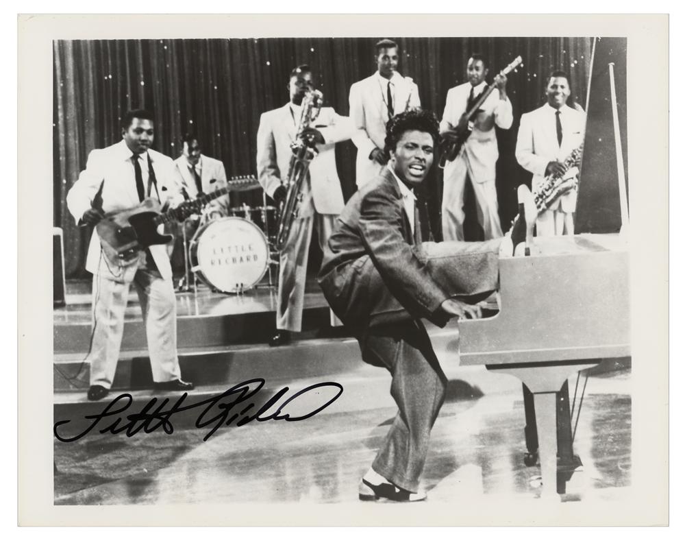 Glossy 14 x 11 photo of Little Richard with a leg up on his piano and his band watching in the background, signed in black felt tip. In fine condition.