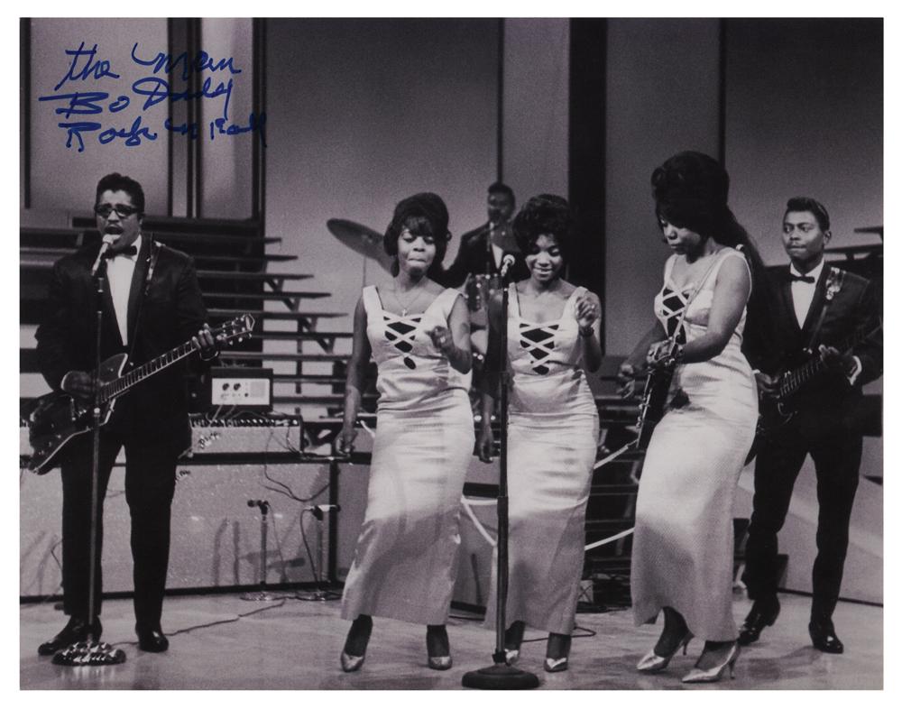 Glossy 14 x 11 photo of a younger Bo Diddley performing with his band, signed in blue felt tip, "The man, Bo Diddley, Rock n roll." In fine condition.