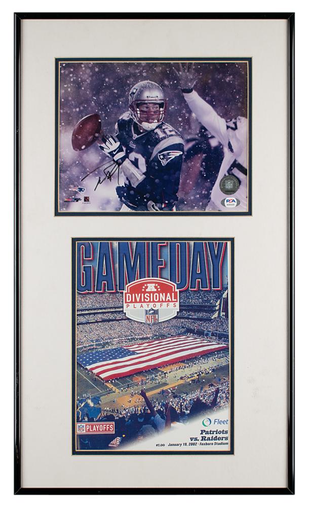 Color glossy 9.5 x 7.5 photo of Tom Brady during the infamous 2001 AFC Divisional Playoff between the New England Patriots and the Oakland Raiders—remembered as the 'Snow Bowl' or 'Tuck Rule' game—signed in black felt tip by Brady. Double-matted and framed with the cover of the program for the game to an overall size of 14.25 x 24.25. In very fine condition, with a PSA/DNA label affixed to the lower corner. Accompanied by a full letter of authenticity from PSA/DNA.