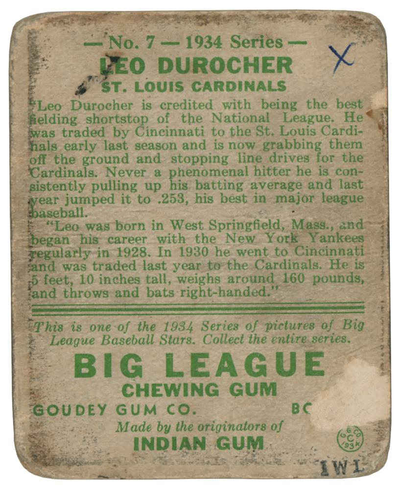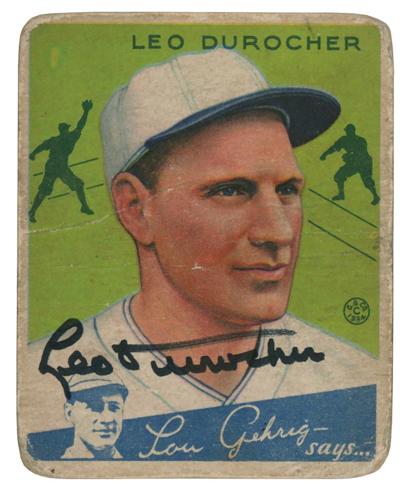 Uncommon 1934 Goudey #7 Leo Durocher baseball card, signed in black felt tip by the Hall of Famer, "Leo Durocher." In good condition, with creasing, rounded corners, soiling, and surface loss and an annotation to reverse.