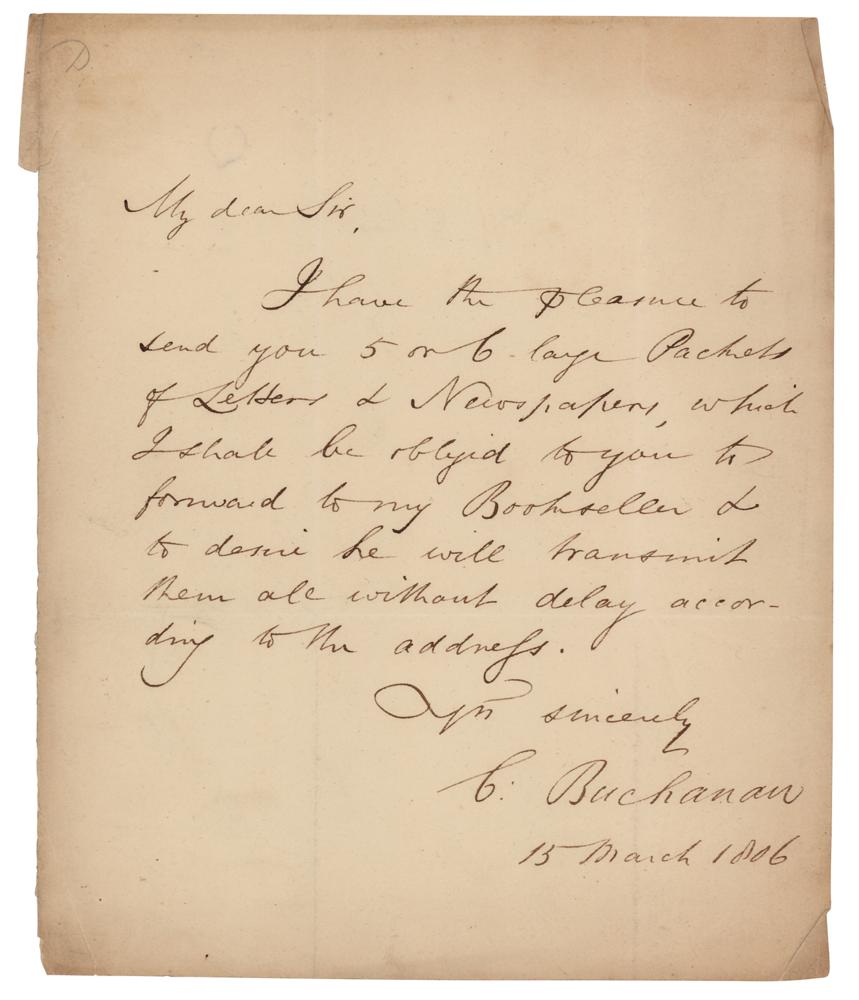 Scottish theologian and missionary (1766-1815) who did much to advance Christianity and native education in India, and supervised the first translation of the Bible into Malayalam. ALS signed “C. Buchanan,” one page, 7.5 x 9, March 15, 1806. Handwritten letter to a gentleman, in full: "I have the pleasure to send you 5 or 6 large Packets of Letters & Newspapers, which I shall be obliged to you to forward to my Bookseller & to desire he will transmit them all without delay according to the address." In fine condition.