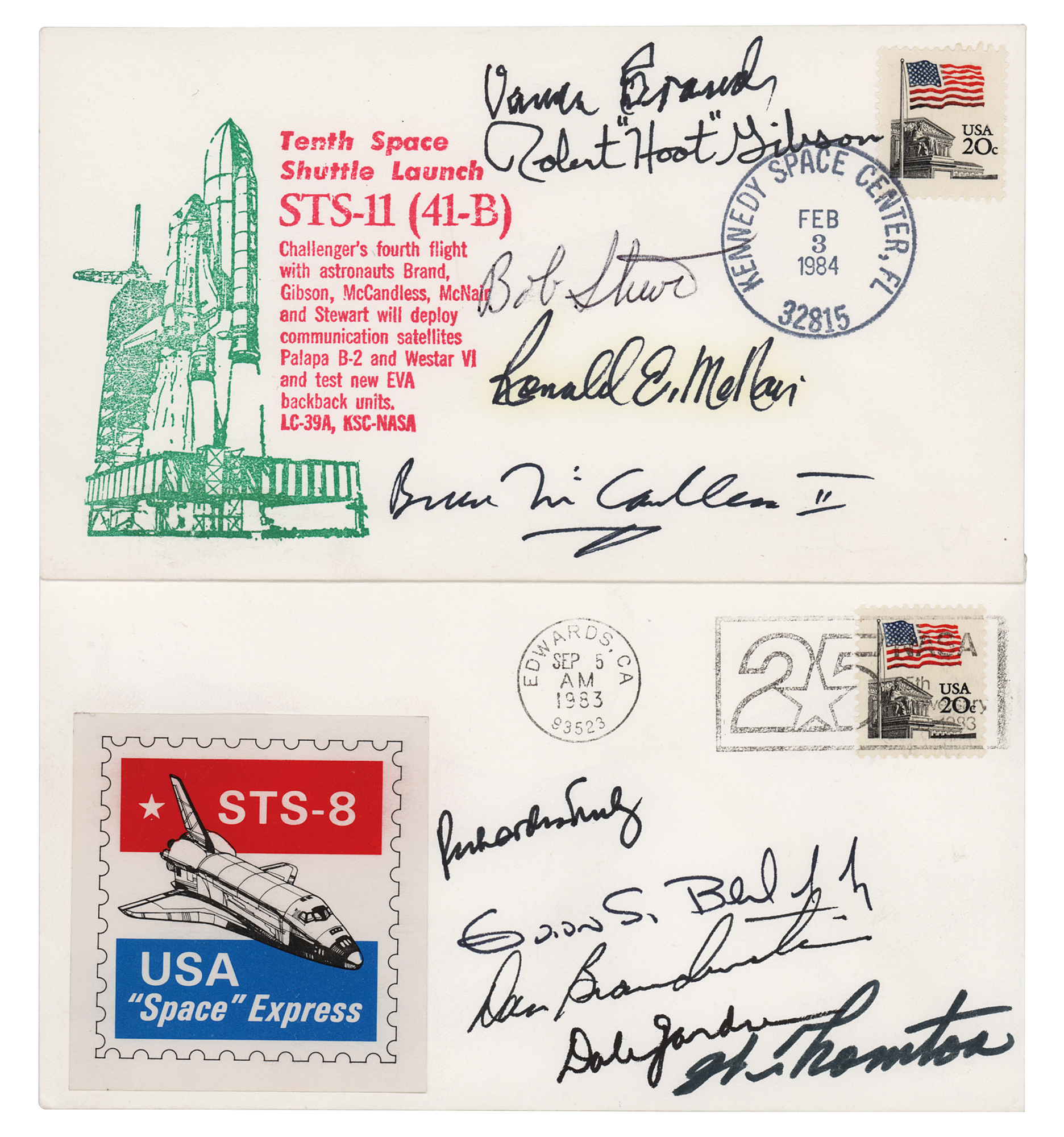 Two commemorative covers with color cachets honoring the Space Shuttle Challenger and STS missions 8 and 11 (41-B), postmarked on either the mission launch or landing date, each signed in black ballpoint or felt tip by the respective crew: Richard Truly, Dan Brandenstein, Guion S. Bluford, Jr., Dale Gardner, and William E. Thornton; and Vance Brand, Robert 'Hoot' Gibson, Bruce McCandless II, Bob Stewart, and Ronald E. McNair. In overall very fine condition.