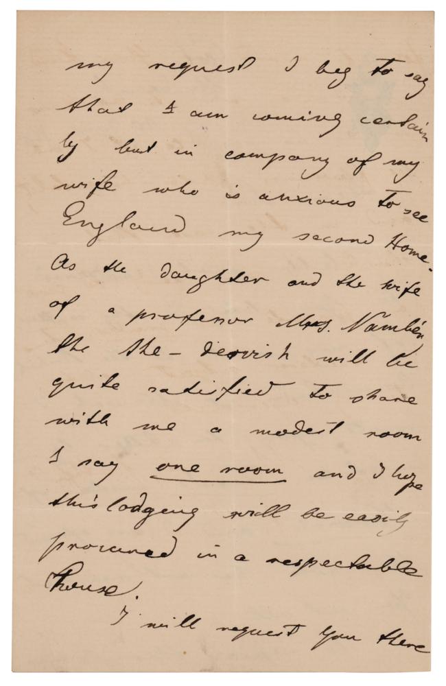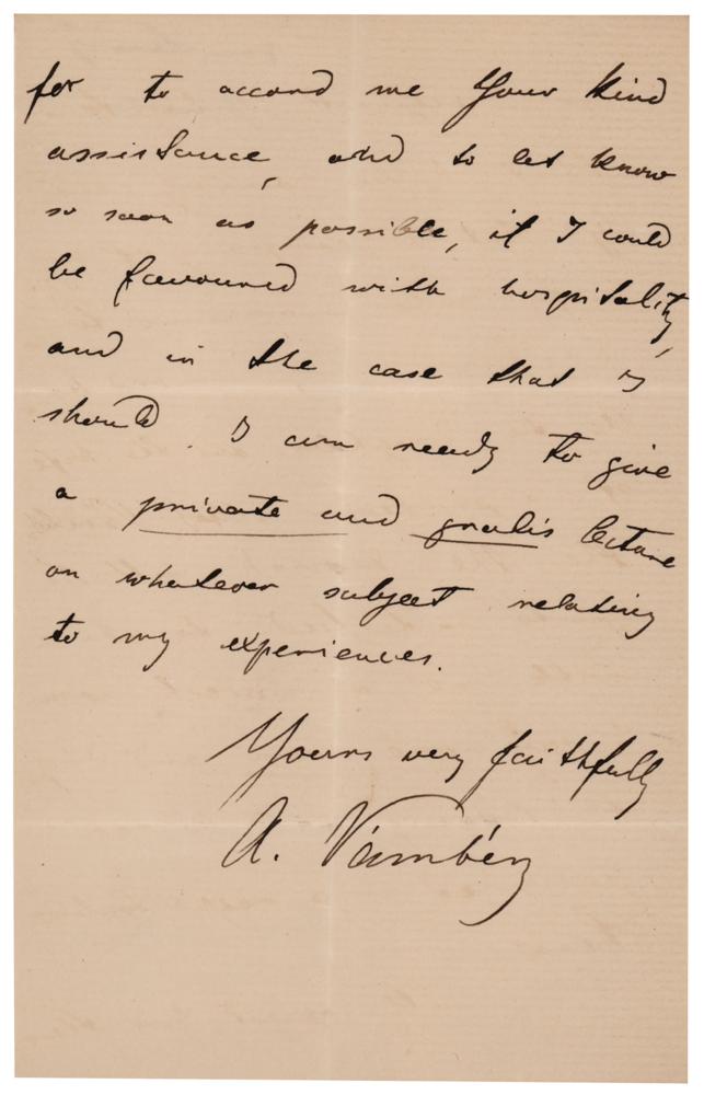 Hungarian traveler, translator, language professor, and spy (1832-1913) said to have introduced Bram Stoker to the legend of Dracula and served as the inspiration for Professor Van Helsing. ALS signed “A. Vambery,” three pages on two adjoining sheets, 4.25 x 6.75, personal letterhead, June 20, 1868. Handwritten letter, in part: "In a letter which I addressed to you lately in the matter of my visit…I beg to say that I am coming certainly but in company of my wife who is anxious to see England my second Home…I am ready to give a private and gratis lecture on whatever subject relating to my experiences." In fine condition.