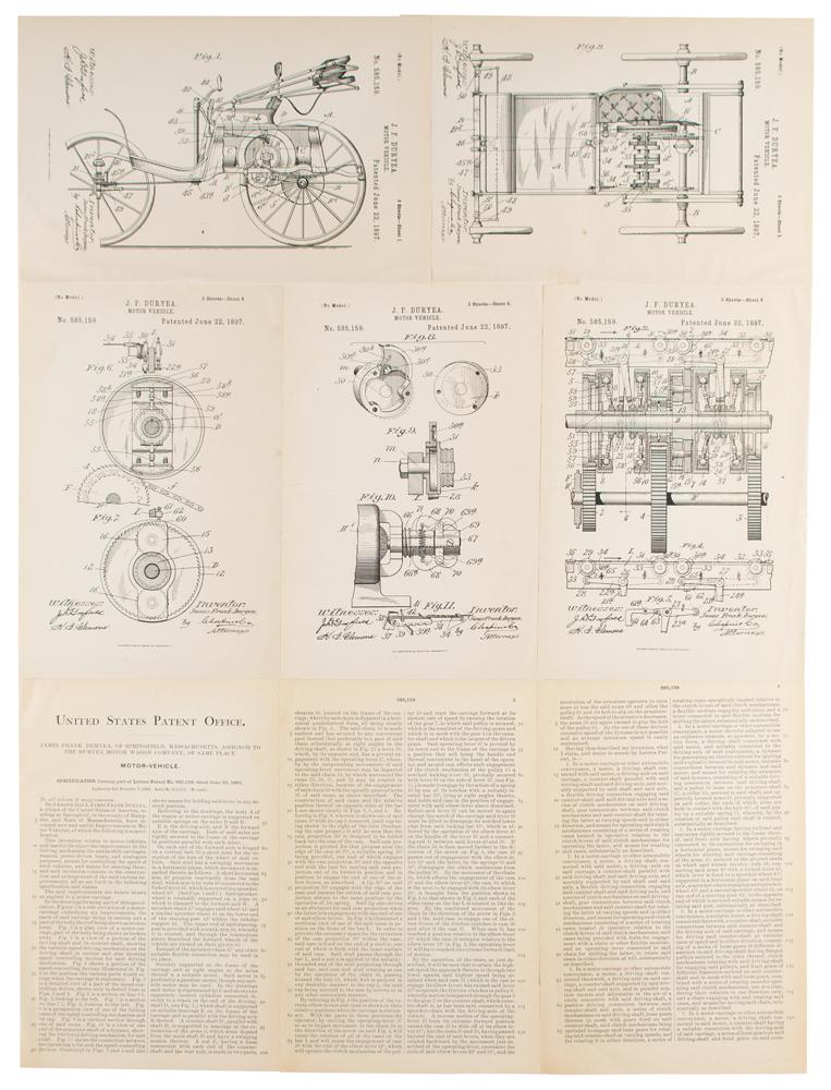Original patent lithographs for James Frank Duryea's "Motor-Vehicle," five pages, 7 x 10.75, June 22, 1897. The diagrams feature side and aerial views of the vehicle, plus schematics for the motor and associated mechanisms. All marked at the bottom: "The Norris Peters Co., Photo-Litho, Washington, D.C." Includes the printed United States Patent Office specification sheet, six pages on three sheets, which describes the invention as an "improvement in the driving mechanism for automobile carriages, wagons, power-driven boats, and analogous purposes." In fine condition.