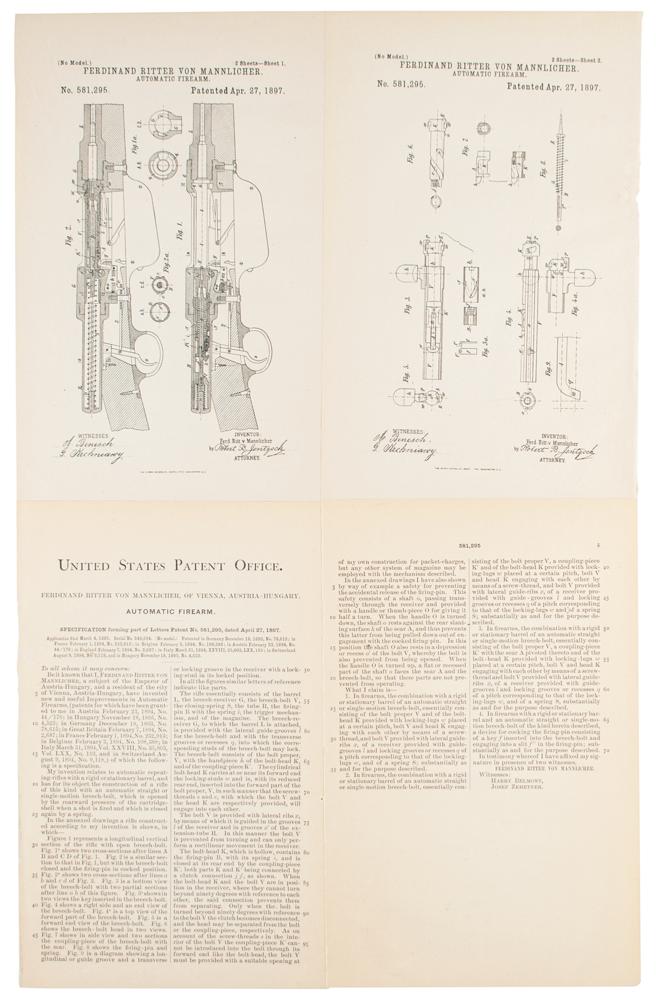 Original patent lithographs for Ferdinand Mannlicher's "Automatic Firearm," two pages, 7 x 10.75, April 27, 1897. The diagrams feature cross-section views of the automatic firearm mechanism, plus schematics of its various components. Both marked at the bottom: "The Norris Peters Co., Photo-Litho, Washington, D.C." Includes the printed United States Patent Office specification sheet, three pages on two sheets, which describes the invention as an improvement relating "automatic repeating-rifles with a rigid or stationery barrel, and has for its object the construction of a rifle of this kind with an automatic straight or single-motion breech-bolt, which is opened by the rearward pressure of the cartridge-shell when a shot is fired and which is closed again by a spring." In fine condition.