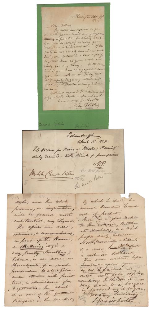 Three autographs by Scottish painters, including: genre painter and royal portraitist David Wilkie (ALS); landscape painter John MacWhirter (ALS); and folklore illustrator Joseph Noel Paton (ANS, signed with his initials). In very good to fine condition, with rusty circular paperclip impressions to edges, and the Wilkie letter affixed to a larger sheet.