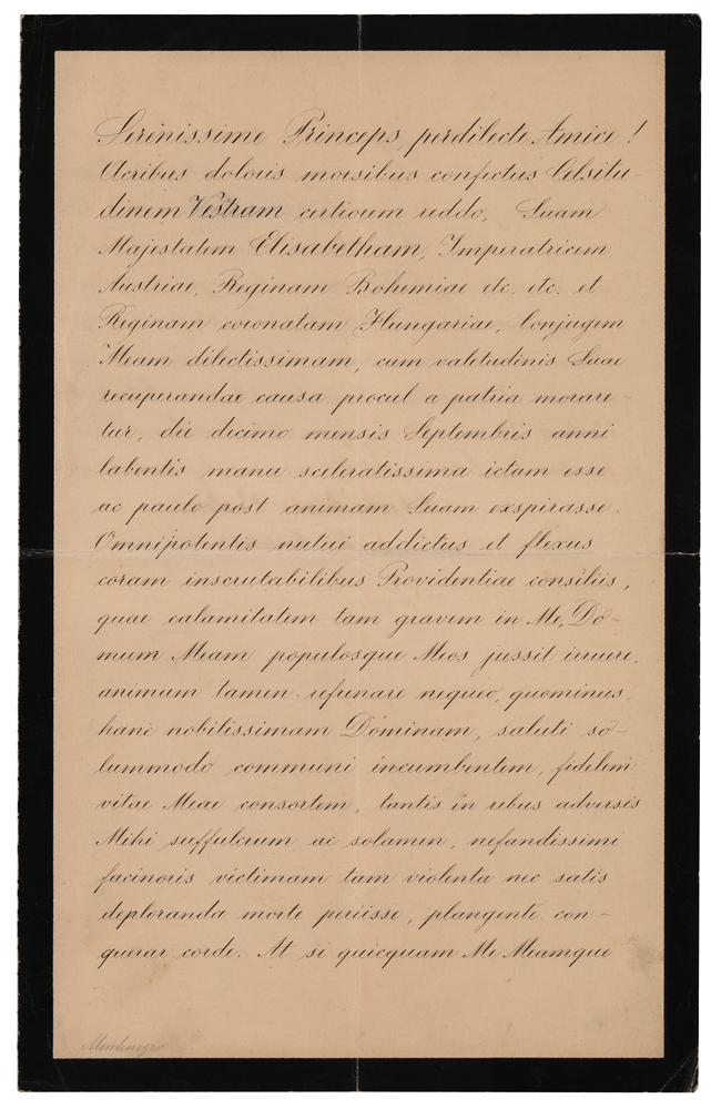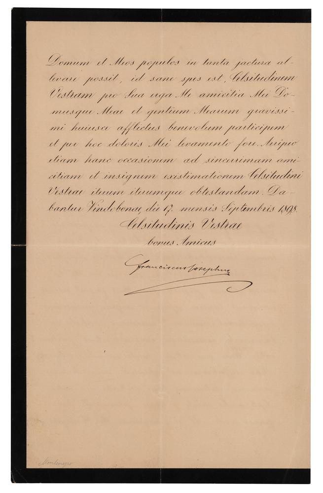 Emperor of Austria and King of Bohemia, Croatia and Hungary (1830-1916) who reigned from 1848 until his death. LS in Latin, signed "Franciscus Josephus," one page both sides, 7.75 x 12.5, September 17, 1898. Untranslated official letter, neatly signed at the conclusion by Franz Joseph I. In fine condition, with central vertical and horizontal folds.