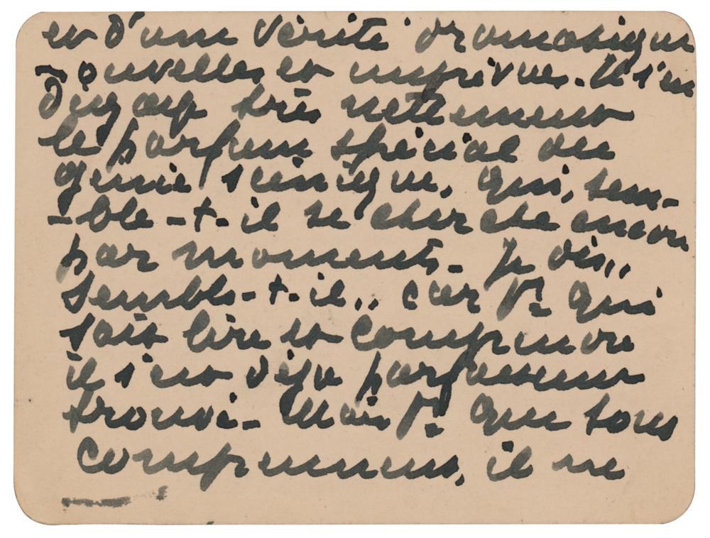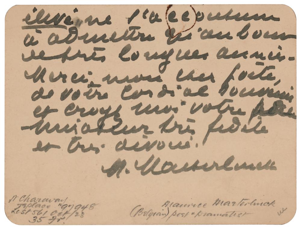 Belgian playwright, poet, and essayist (1862-1949) awarded the Nobel Prize in Literature in 1911. ALS in French, signed “M. Maeterlinck,” on both sides of two 4.5 x 3.5 cards, December 9, 1901. Untranslated handwritten letter by Maeterlinck. In fine condition.