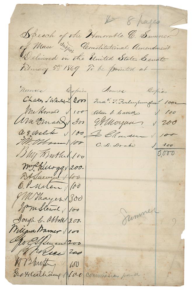 Significant manuscript DS, one page, 8 x 12.5, 1869. Order form document for the "Speech of the Honorable C. Sumner of Mass., subject Constitutional Amendment Delivered in the United States Senate, February 5th, 1869, to be printed," signed below by 22 members of the 40th United States Congress, all adding the number of copies desired. Signers are: Charles Sumner, Jacob M. Howard, Alexander McDonald, Adonijah Welch, Thomas W. Osborn, Benjamin F. Butler, William Pitt Kellogg, Frederick A. Sawyer, Oliver P. Morton, John M. Thayer, William M. Stewart, Joseph C. Abbott, Willard Warner, George E. Spencer, Benjamin F. Rice, Henry B. Anthony, George H. Williams, Frederick T. Frelinghuysen, Alexander G. Cattell, Edwin D. Morgan, Zachariah Chandler, and Charles D. Drake. In very good condition, with scattered soiling and some small tears and losses to the edges.