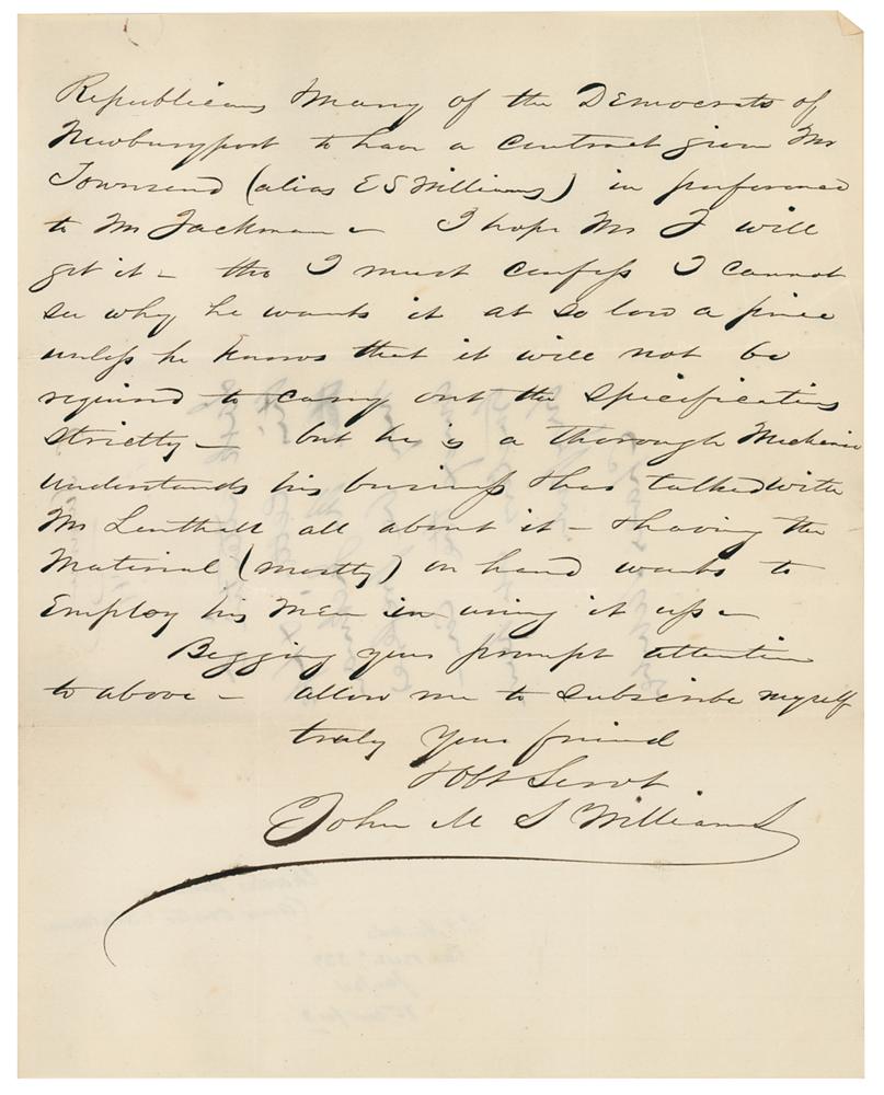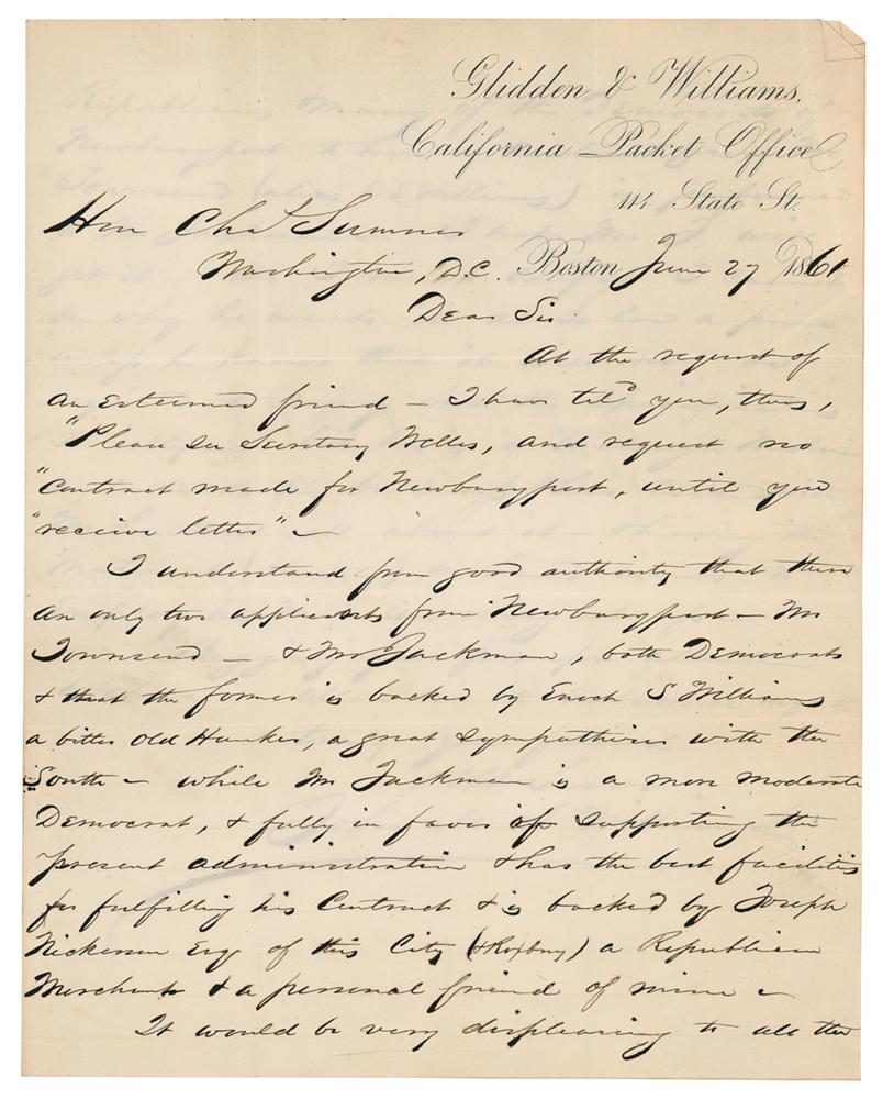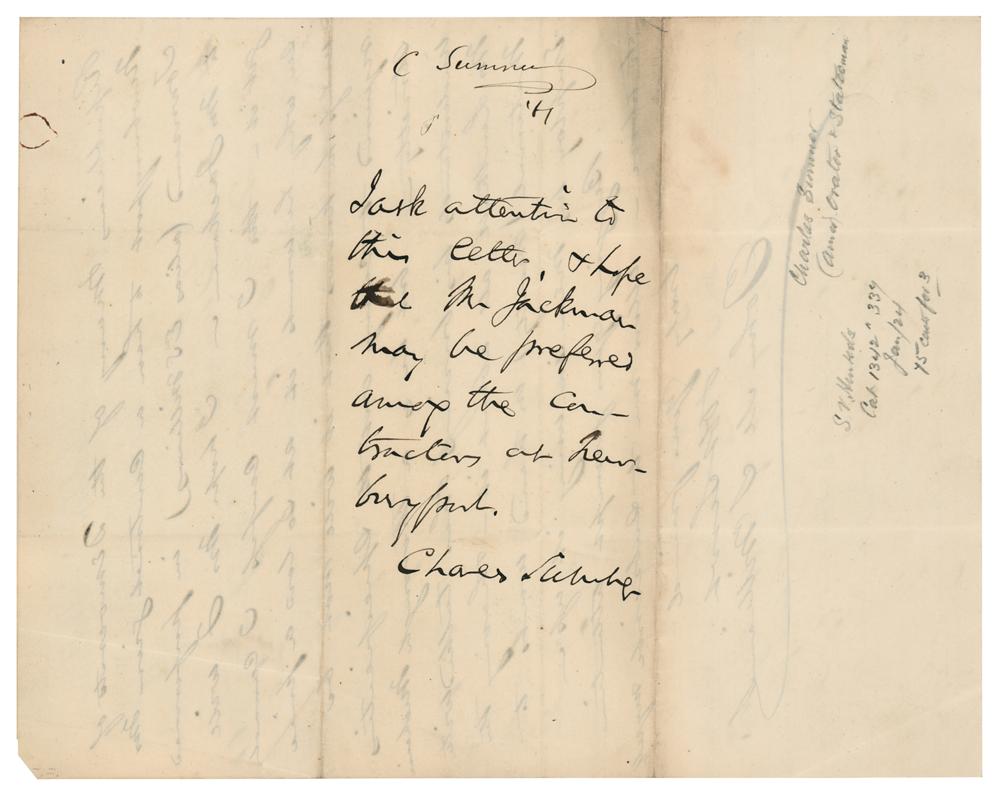 Civil War-dated autograph endorsement signed "Charles Sumner," on the reverse of a letter written to him by John M. S. Williams, two pages on two adjoining sheets, 7.75 x 9.75, June 27, 1861. Sumner writes: "I ask attention to this letter & hope that Mr. Jackman may be preferred among the contractors at Newburyport." In the letter, Williams asks Sumner to refer a matter to Secretary of the Navy Gideon Welles, offering information about applicants for a contract at Newburyport: "I understand from good authority that there are only two applicants from Newburyport—Mr. Townsend, & Mr. Jackman, both Democrats & that the former is backed by Enoch S. Williams, a bitter old hunker, s great sympathizer with the South—while Mr. Jackman is a more moderate Democrat, & fully in favor of supporting the present administration & has the best facilities for fulfilling the contract." In fine condition, with a rusty circular paperclip impression to the top and a few light creases.