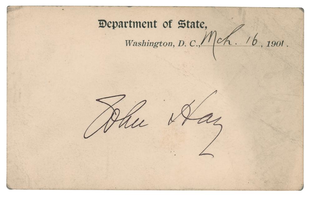 Private secretary (1838-1905) to and, later, biographer of Abraham Lincoln who also served as secretary of state under McKinley and Roosevelt. Ink signature, "John Hay,” on an official off-white 5 x 3 Department of State card, dated March 16, 1901. In very good to fine condition, with diagonal creasing to the upper right.