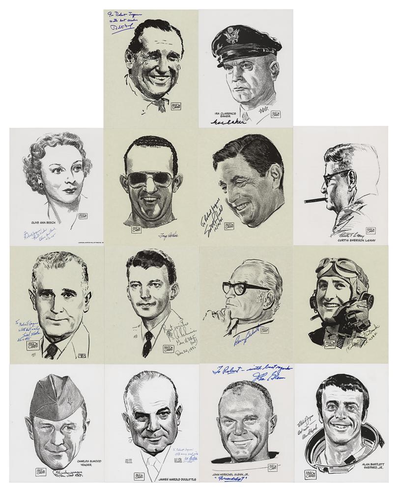 Group lot of 14 prints of portrait sketches by cartoonist Milton Caniff of various heroes of aviation, including Air Force pilots and generals, astronauts, and industry pioneers, each 8 x 10, including (some inscribed): Alan Shepard, John Glenn, Chuck Yeager, James H. Doolittle, Scott Crossfield, Curtis LeMay, Ira C. Eaker, Barry Goldwater, Olive Ann Beech, Gabby Gabreski, Bernard Schriever, Tony LeVier, Robert Six, and Leigh Wade. In overall fine condition.