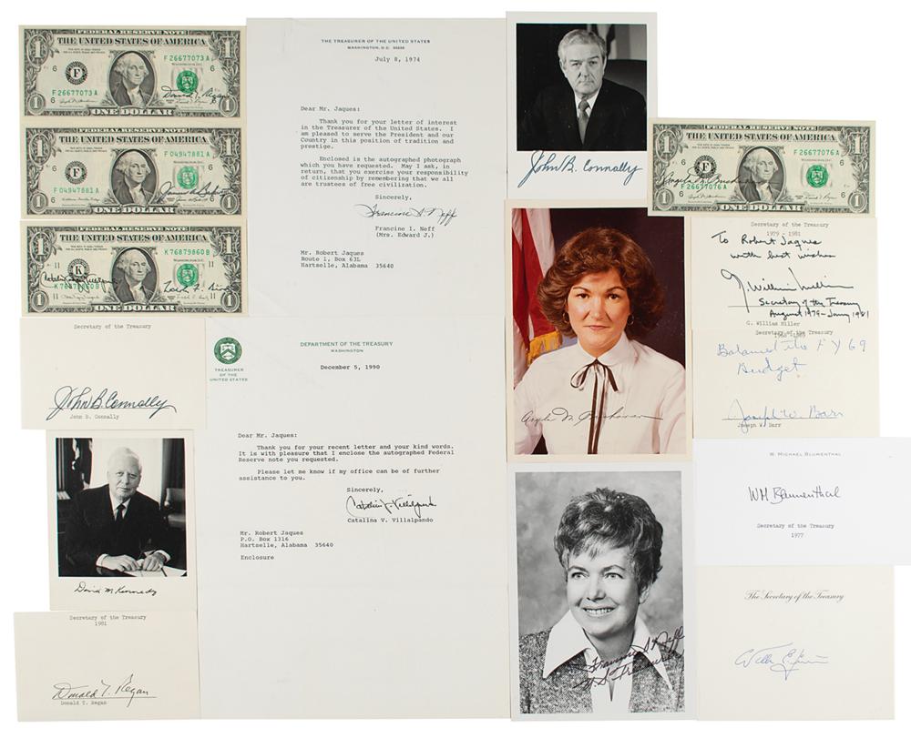 Group lot of 16 items signed by either a former United States Secretary of the Treasury or by a former Treasurer of the United States. The secretaries: James Baker (dollar bill), Joseph W. Barr (index card), W. Michael Blumenthal (personal stationery card), John Connally (2: SP and index card), David M. Kennedy (SP), G. William Miller (index card), Donald Regan (2: dollar bill and index card), and William E. Simon (stationery card). The treasurers: Angela Marie Buchanan (2: SP and dollar bill), Francine Irving Neff (2: TLS and SP), and Catalina Vasquez Villalpando (2: TLS and dollar bill). Includes some transmittal letters and mailing envelopes. In overall fine condition.