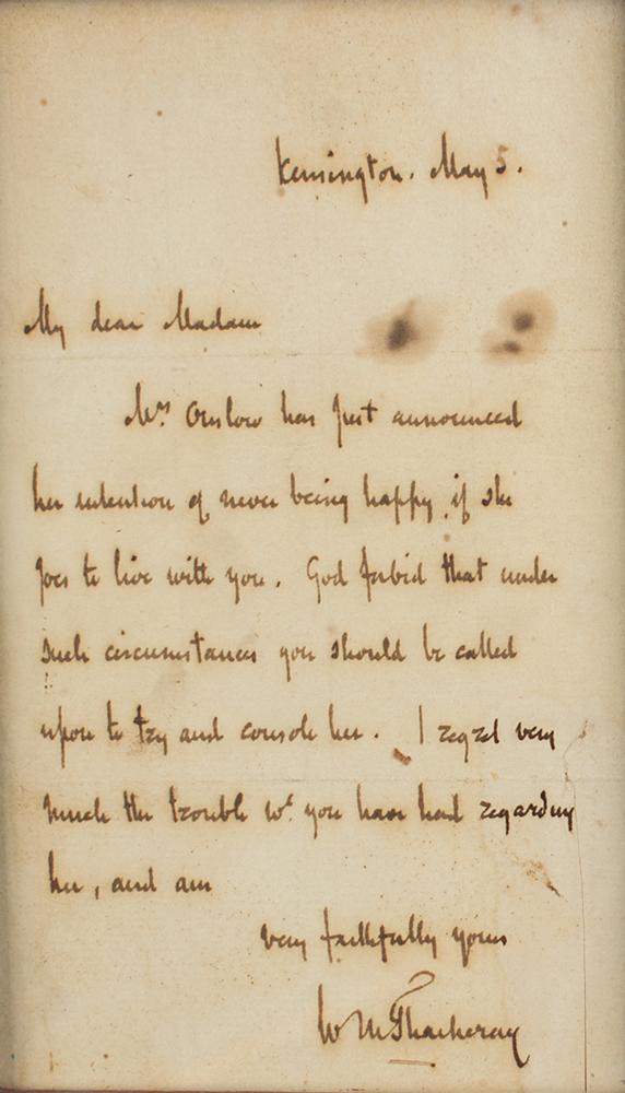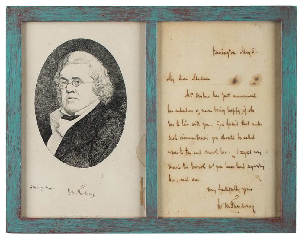 ALS signed “W. M. Thackeray,” one page, 4.25 x 6.75, May 5. Letter handwritten from Kensington, in full: "Mrs. Onslow has just announced her intention of never being happy if she goes to live with you. God forbid that under such circumstances you should be called upon to try and console her. I regret very much the trouble w'h you have had regarding her." Framed with an engraving bearing a facsimile autograph to an overall size of 10 x 8. In very good to fine condition, with light soiling and staining, and a short slice to the lower right.