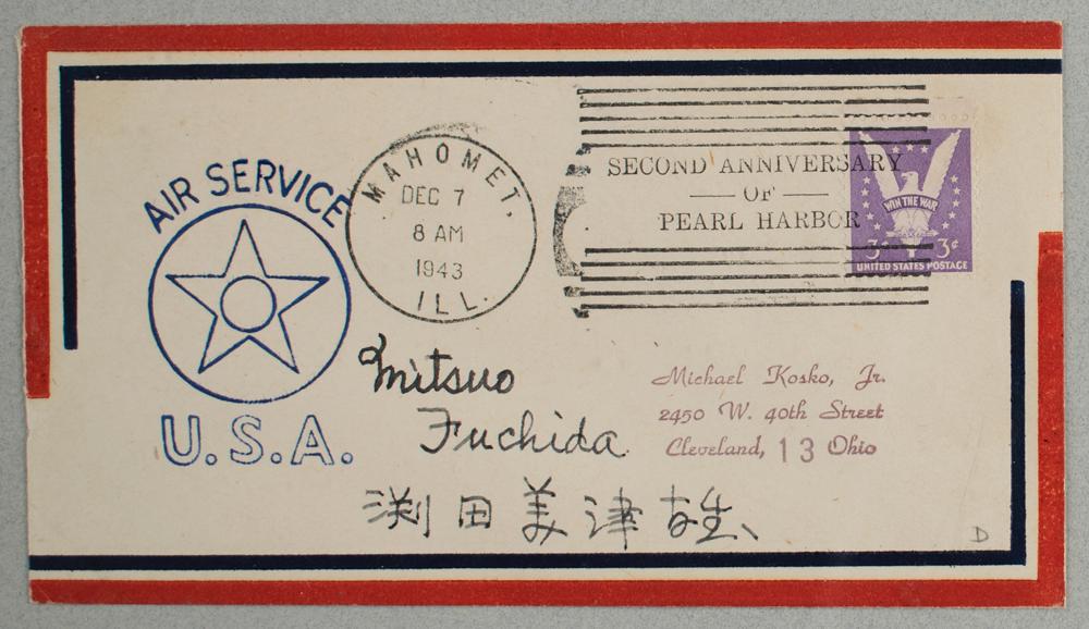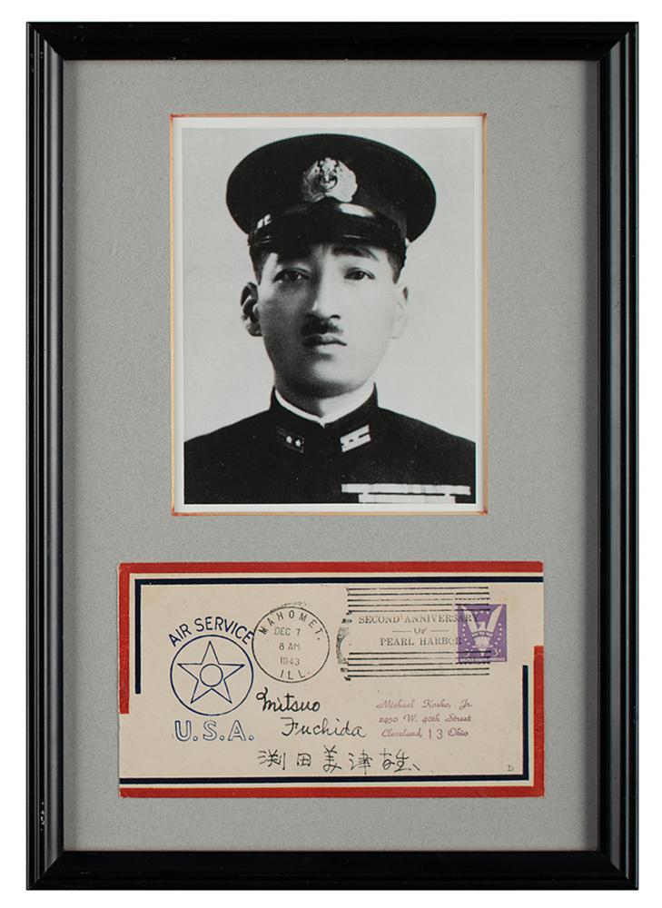 One of Japan's most skilled fliers, Fuchida (1902-1976) commanded the air attack against Pearl Harbor on December 7, 1941, and was the last to leave the battle area. After World War II, Fuchida converted to Christianity and became a nondenominational preacher, traveling frequently to America and later becoming a U.S. citizen. U.S.A. Air Service cover postmarked on December 7, 1943, and bearing a "Second Anniversary of Pearl Harbor" stamp, signed in English and Japanese in fountain pen, "Mitsuo Fuchida." Mounted and framed with a portrait to an overall size of 9.5 x 13.5. In fine condition.