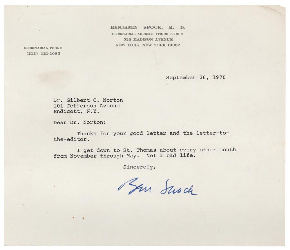Baby doctor and best selling author (1903-1998) whose book Baby and Child Care, published in 1946, is one of the biggest best-sellers of all time. TLS signed "Ben Spock," one page, 8.5 x 7.25, personal letterhead, September 26, 1970. Letter to Dr. Gilbert C. Norton, in full: "Thanks for your good letter and the letter-to-the-editor. I get down to St. Thomas about every other month from November through may. Not a bad life." In fine condition, with a faint stain above the recipient's address.