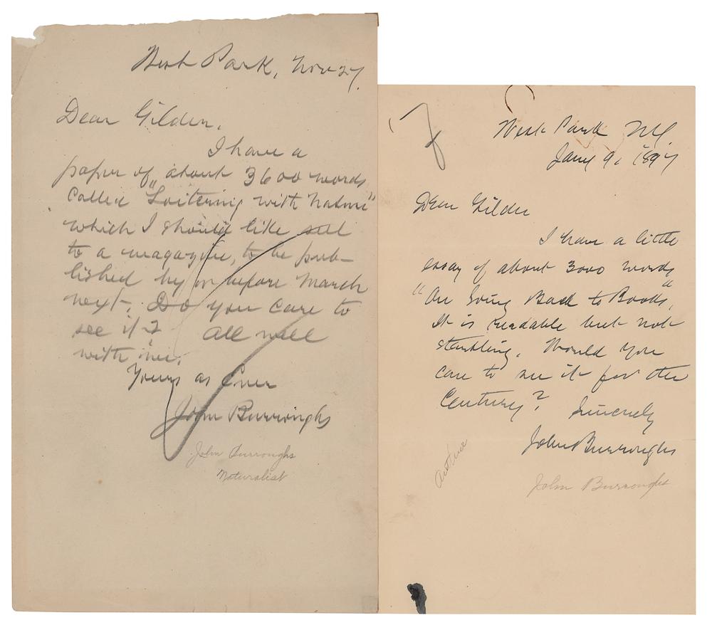 Two ALSs, each one page, dated November 27 [no year] and January 9, 1897. Both to editor Richard Watson Gilder, concerning potential publication of literary works. The first, in pencil, in part: "I have a paper of about 3600 words called 'Loitering with Nature' which I should like sold to a magazine, to be published by or before March next. Do you care to see it?" The second, in ink, in part: "I have a little essay of about 3000 words 'On Going Back to Books.' It is readable?Would you care to see it for the Century?" In overall fine condition, with a thick checkmark over the signature on the pencil letter, and a rusty circular paperclip impression to the top of the other letter.