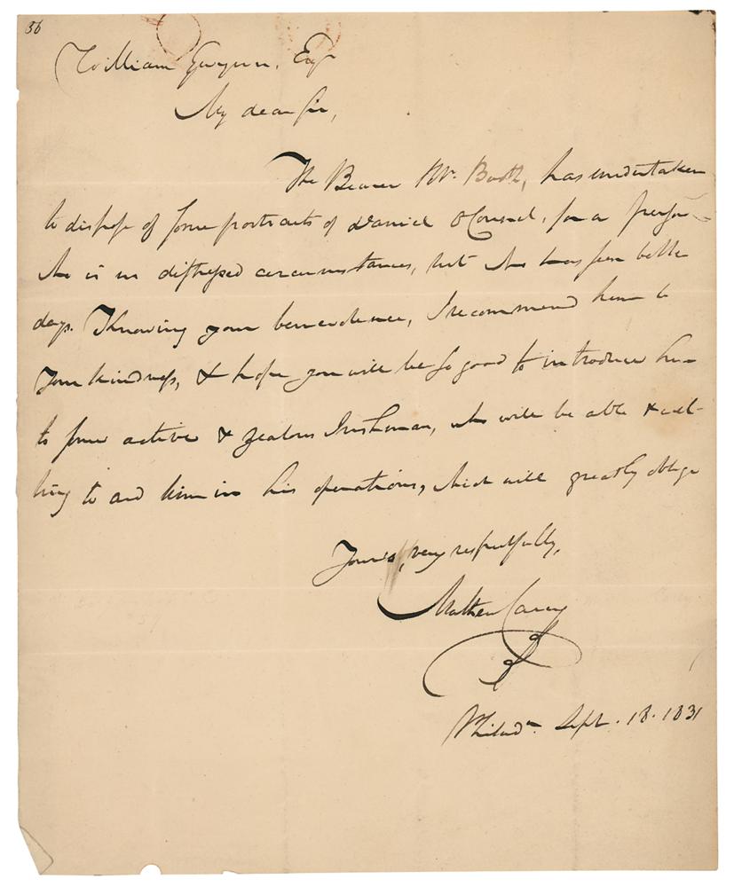 Irish-born publisher and economist (1760-1839) remembered for his Philadelphia-based political periodicals The Pennsylvania Herald, Columbian Magazine, and The American Museum. ALS, one page, 8 x 9.75, September 18, 1831. Handwritten letter to William Gwynn, in part: "The Bearer Mr. Booth, has undertaken to dispose of some portraits of Daniel O'Connell, for a person who is in no distressed circumstances, but who has seen better days. Knowing your benevolence, I recommend him to your kindness, & hope you will be so good to introduce him to some active & zealous Irishman, who will be able & willing to aid him in his operations." In fine condition, with a few tiny edge chips and rusty circular paperclip impressions to the top.