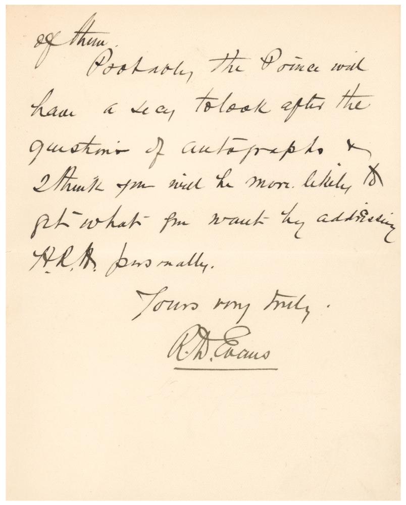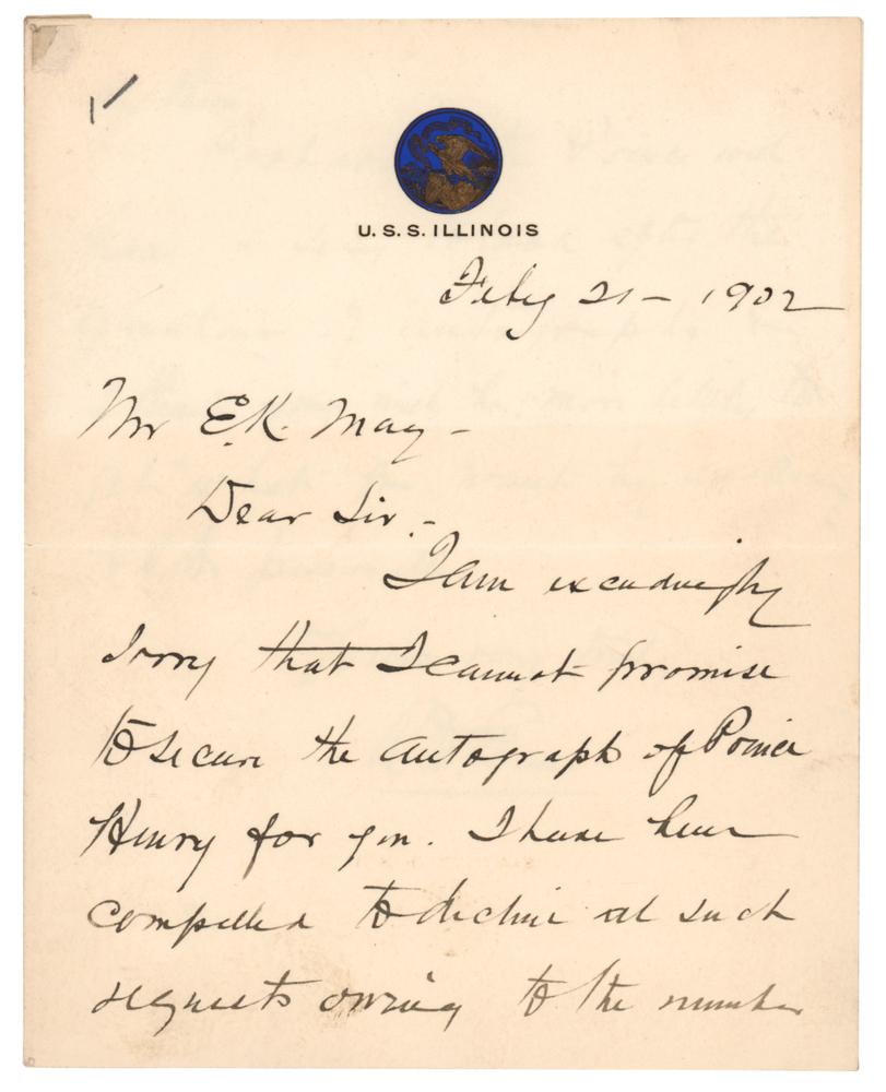 Rear admiral (1846-1912) in the United States Navy, who served from the Civil War to the Spanish-American War; in 1907-1908, he commanded the Great White Fleet on its worldwide cruise from the Atlantic Ocean through the Straits of Magellan to the Pacific Ocean. ALS signed “R. D. Evans,” two pages on two adjoining sheets, 5 x 6.25, U.S.S. Illinois letterhead, February 21, 1902. Handwritten letter to E. K. May, in part: "I am exceedingly sorry that I cannot promise to secure the autograph of Prince Henry for you. I have been compelled to decline at such requests owing to the number of them?I think you will be more likely to get what you want by addressing H.R.H. personally." In fine condition.