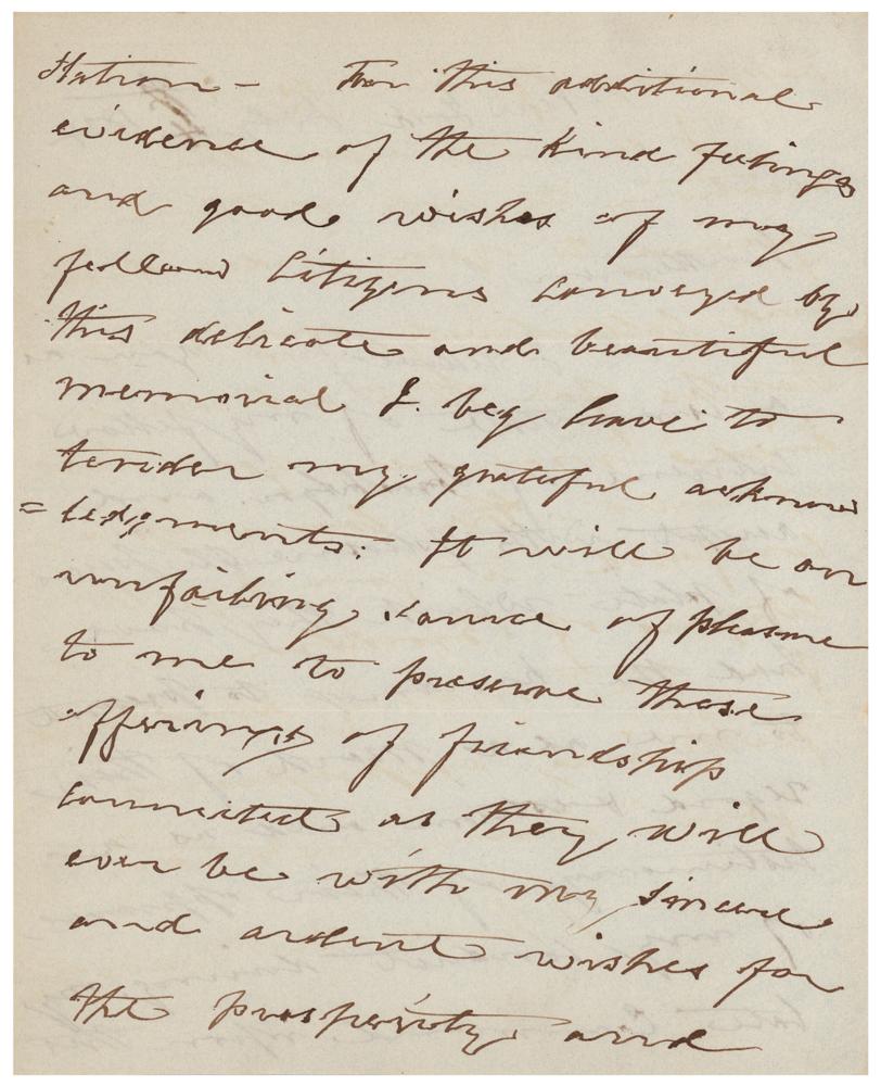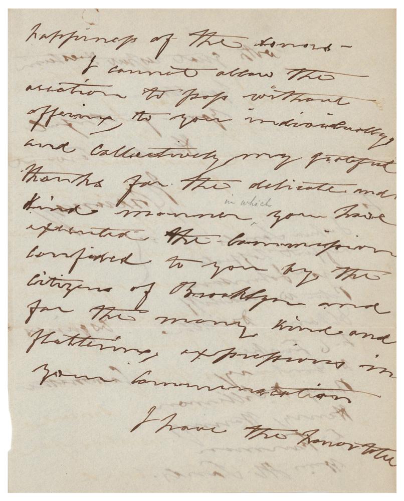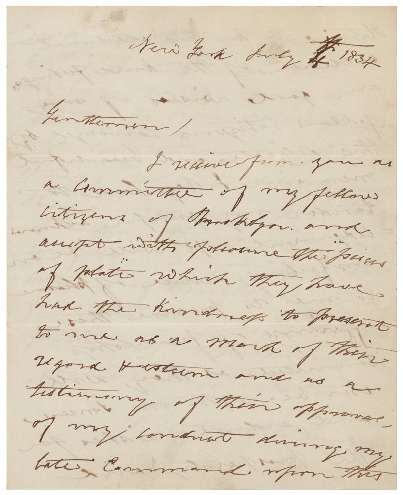 Commodore (1772-1840) in the United States Navy who served in the Quasi-War, The Barbary Wars and the War of 1812. ALS, four pages on two adjoining sheets, 7.75 x 9.75, July 4, 1834. Handwritten letter to a Brooklyn committee, thanking them for a gift. In part: "I receive from you as a committee of my fellow citizens of Brooklyn and accept with pleasure the pieces of plate which they have had the kindness to present to me as a mark of their regard & esteem and as a testimony of their approval of my conduct during my late command." In very good to fine condition, with a rusty circular paperclip impression to the top and some adhesive remnants along the edge.