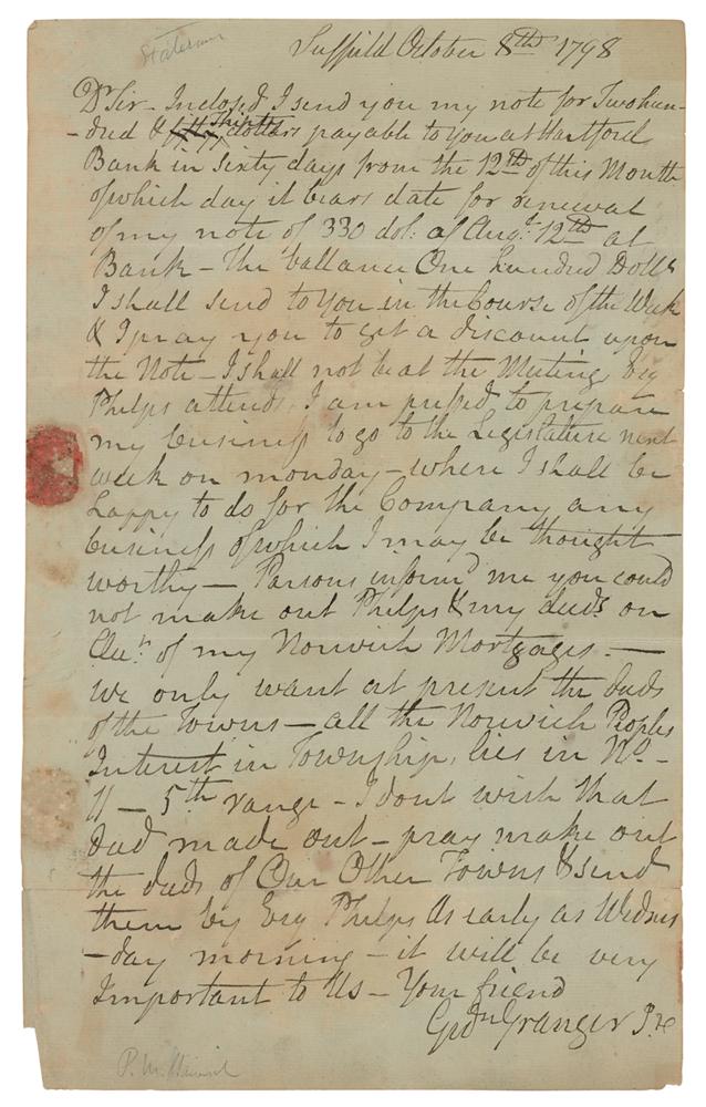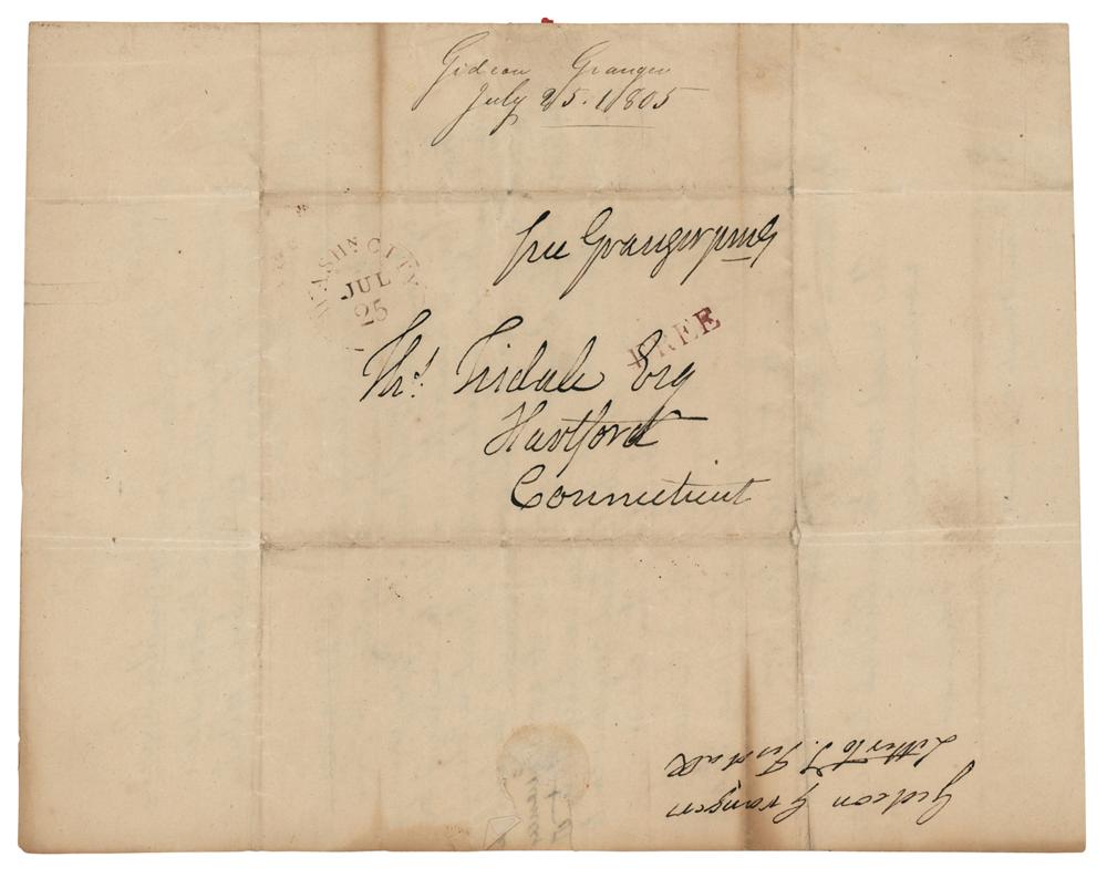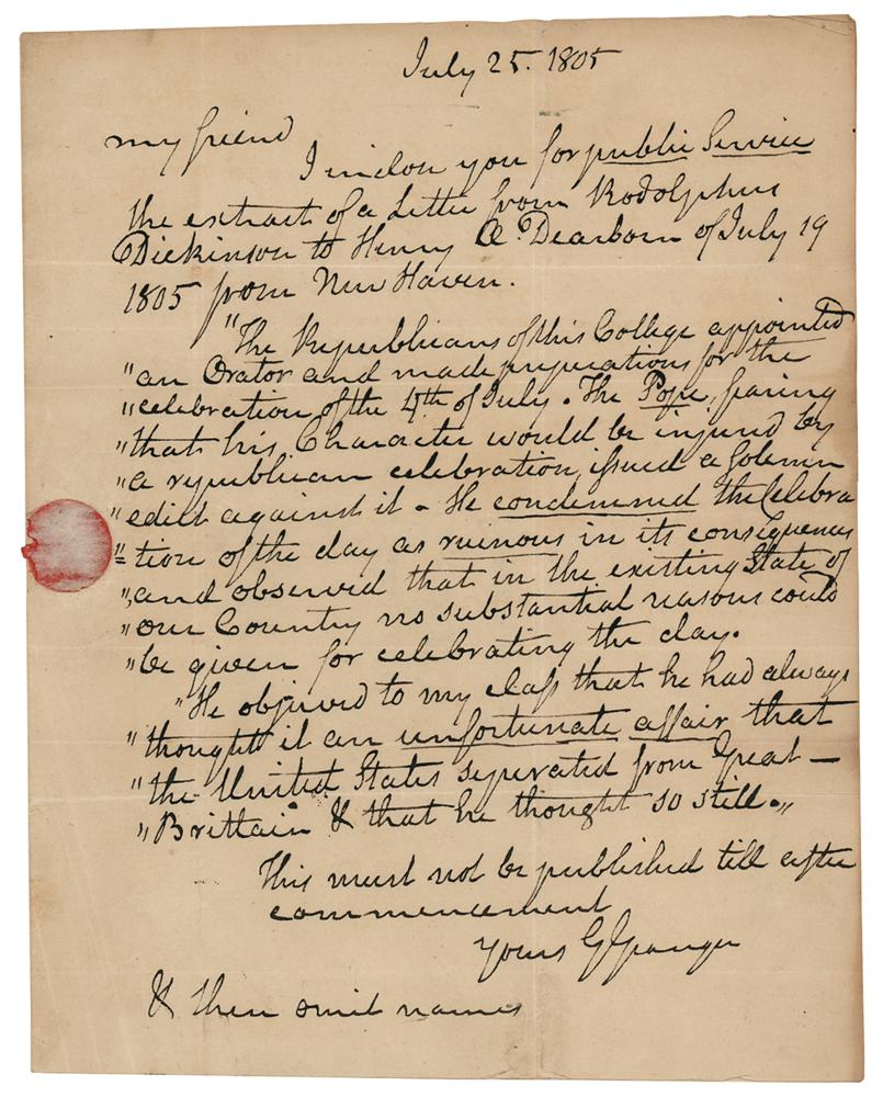 American politician and lawyer (1767-1822) who was the United States' longest-serving postmaster general, occupying the post from 1801 to 1814 during the Jefferson and Madison administrations. Interesting ALS signed “G. Granger,” one page, 7.75 x 10, July 25, 1805. Interesting handwritten letter regarding the celebration of Independence Day, in full: "I inclose you for public service the extract of a Letter from Rodolphus Dickinson to Henry Dearborn of July 19, 1805 from New Haven: 'The Republicans of this College appointed an Orator and made preparations for the celebration of the 4th of July. The Pope, fearing that his Character would be injured by a republican celebration, issued a solemn edict against it. He condemned the Celebration of the day as ruinous in its consequences and observed that in the existing State of our Country no substantial reasons could be given for celebrating the day. He observed to my class that he had always thought it an unfortunate affair that the United States separated from Great Britain & that he thought so still." Addressed on the integral leaf in Granger's hand, and franked in the upper right, "free, Granger, P.M.G." In fine condition. Accompanied by a 1798 autograph letter signed by Granger concerning a financial matter.
