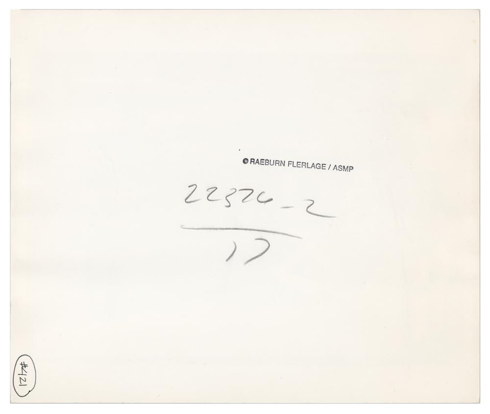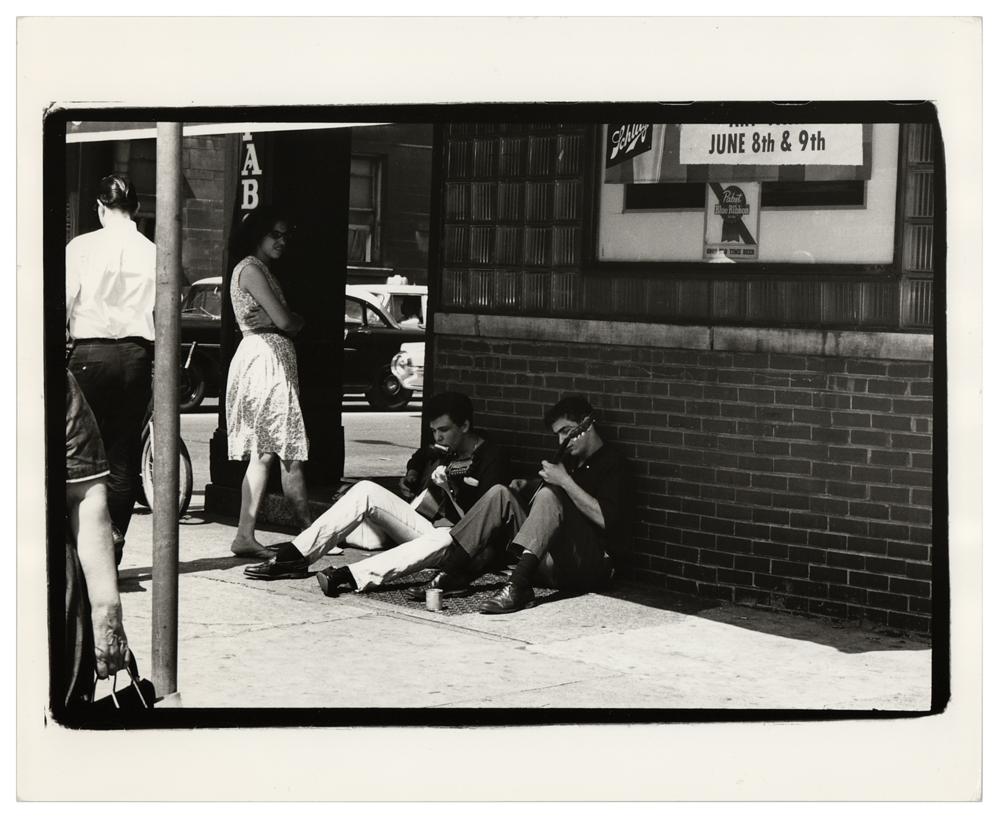 Original 10 x 8 silver gelatin photograph of Mike Bloomfield and his friend Roy Ruby busking on the sidewalk outside a Chicago liquor store at the corner of North and Wells in 1963, taken by Raeburn Flerlage. Reverse bears a "Raeburn Flerlage / ASMP" credit stamp and numerical annotations. In fine condition, with a mild horizontal bend. Raeburn Flerlage (1915-2002) was a photographer known for capturing the blues and folk scenes in 1960s Chicago, documenting the likes of Howlin’ Wolf, Muddy Waters, John Lee Hooker, Odetta, John Coltrane, and Bob Dylan.