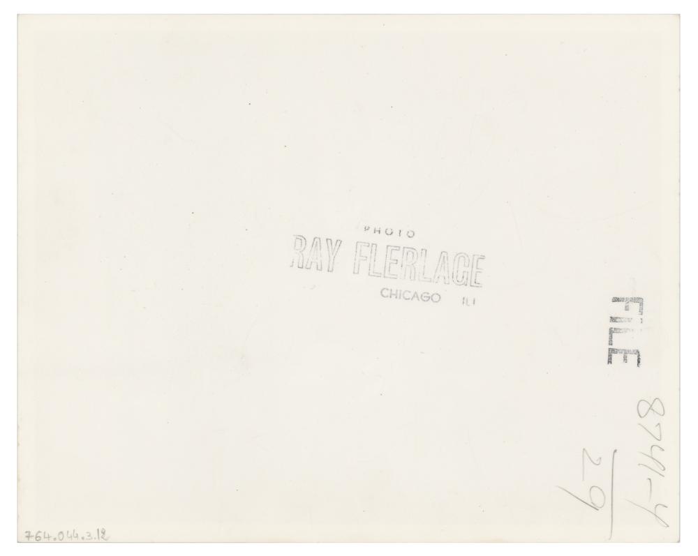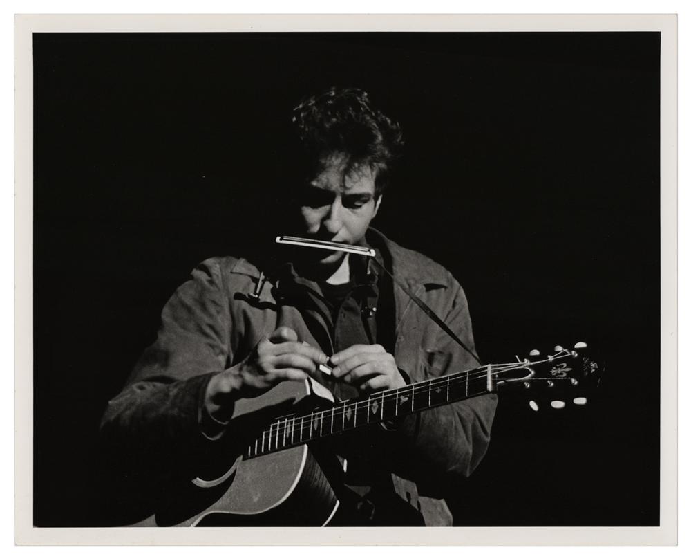 Original 10 x 8 silver gelatin photograph of Bob Dylan performing at Chicago's Orchestra Hall on December 27, 1963, taken by Raeburn Flerlage. Reverse bears a "Ray Flerlage / Chicago" credit stamp and numerical pencil caption. In fine condition, with a light horizontal bend. Raeburn Flerlage (1915-2002) was a photographer known for capturing the blues and folk scenes in 1960s Chicago, documenting the likes of Howlin’ Wolf, Muddy Waters, John Lee Hooker, Odetta, John Coltrane, and Bob Dylan.