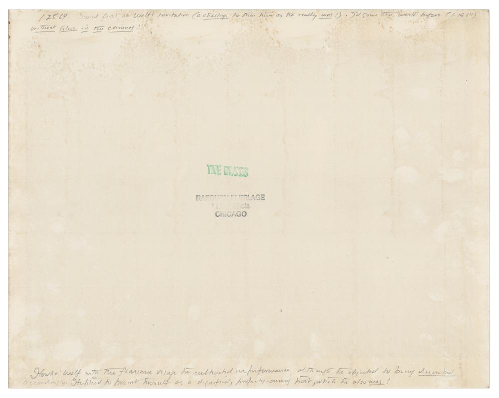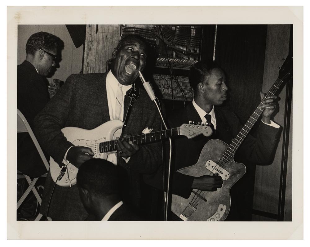 Oversized original 14 x 11 silver gelatin photograph showing Howlin' Wolf with Andrew Blue Blood McMahon (electric bass) and Johnny Jones (piano) during an energetic performance at Silvio's in Chicago in January 1964, taken by Raeburn Flerlage. Reverse bears a "Raeburn Flerlage / ASMP" credit stamp and pencil captions. In fine condition. Raeburn Flerlage (1915-2002) was a photographer known for capturing the blues and folk scenes in 1960s Chicago, documenting the likes of Howlin’ Wolf, Muddy Waters, John Lee Hooker, Odetta, John Coltrane, and Bob Dylan.