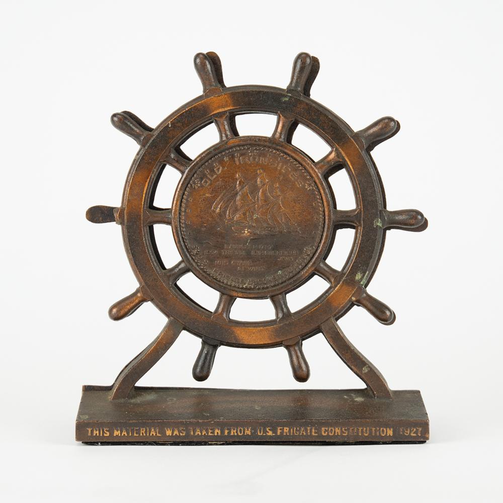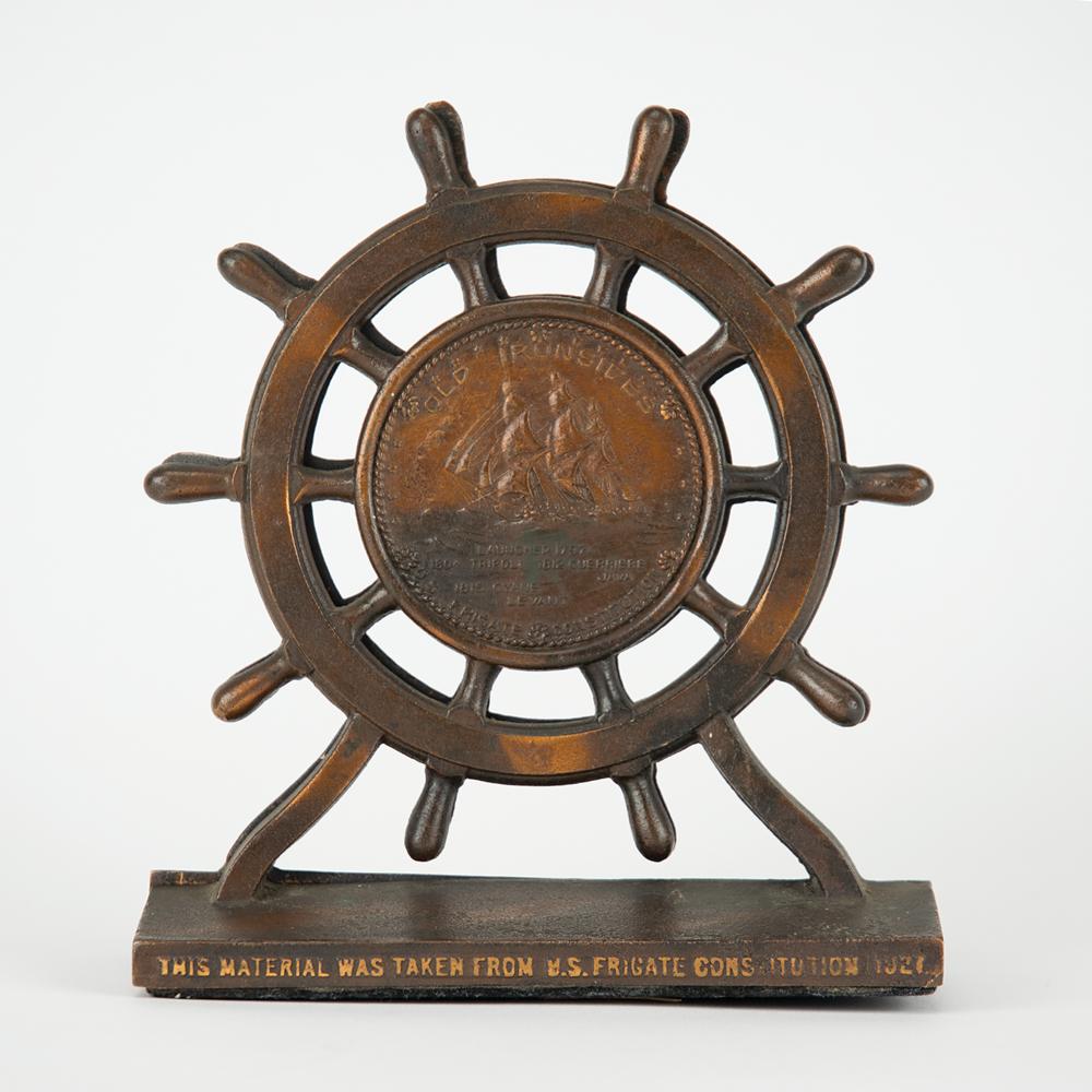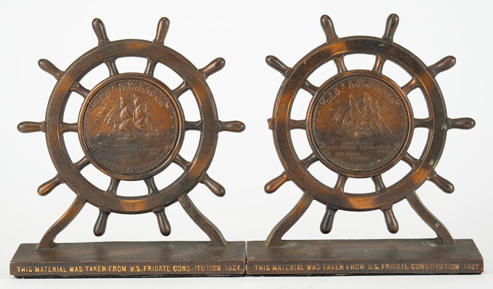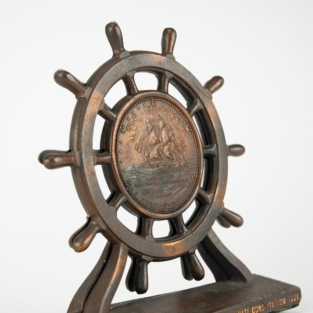 Pair of foundry cast bronze bookends made from metal reclaimed during the 1927 restoration of the USS Constitution. The bookends measure 6 x 6.5 and feature a ship's wheel on a lead-weighted base, which reads: "This material was taken from US Frigate Constitution 1927." The inner barrel of the wheel features an embossed image of the three-masted heavy frigate, with raised text: "Old Ironsides, Launched 1797, 1804 Tripoli, 1812 Guerriere Java, 1815 Cyane Levant, U.S. Frigate Constitution." In fine condition, with a handle to one wheel missing.