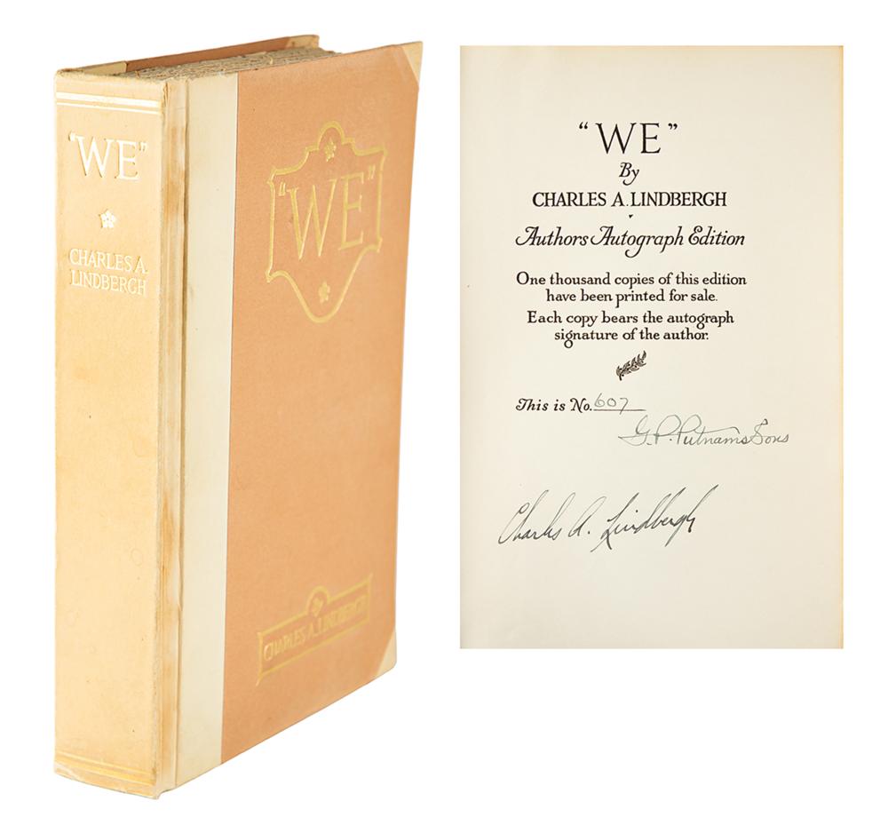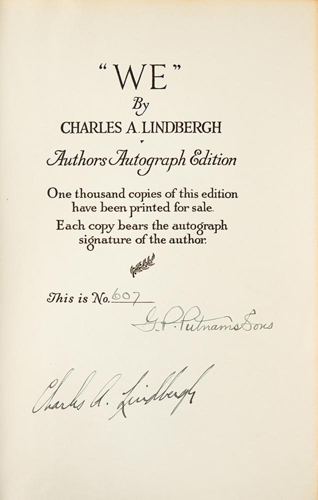 Signed book: We. Special author's autograph edition, limited issue, numbered 607/1000. NY: G. P. Putnam's Sons, 1927. Hardcover, 6.75 x 10.25, 308 pages. Signed on the colophon in fountain pen, "Charles A. Lindbergh." Autographic condition: fine. Book condition: VG/None, with irregular toning to joints, sunning to spine, an ownership inscription to first free end page, and owner's notations on Lindbergh and his flight neatly penned on the last three pages. A beautifully signed, limited edition example of Lindbergh's autobiography, published just after his famous 1927 solo transatlantic flight.
