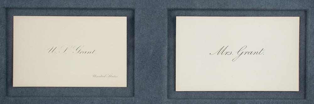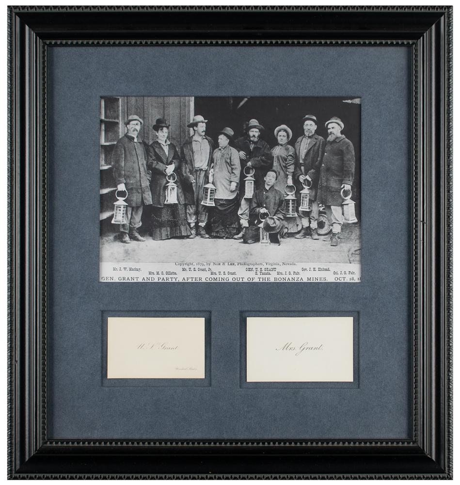 Uncommon pair of individual calling cards belonging to Ulysses S. Grant and his wife, Julia Dent, 3.5 x 2.25 and 3.75 x 2.25, with the cards reading: “U. S. Grant, United States” and “Mrs. Grant.” Both are mounted and framed together with a photo to an overall size of 16 x 17. In overall very fine condition.
