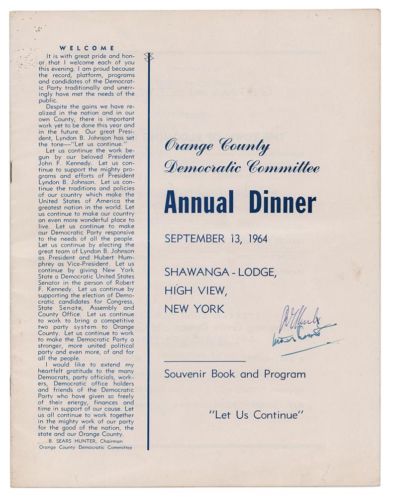 Souvenir book and program for the Orange County Democratic Committee Annual Dinner, held at the Shawanga Lodge in High View, New York, on September 13, 1964, 20 pages, 8.25 x 10.75, signed on the front cover in ballpoint, "R. F. Kennedy," with another signature just below. In very good to fine condition, with general handling wear, and a central horizontal fold.