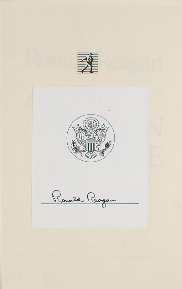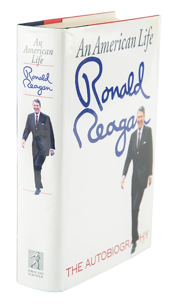 Signed book: An American Life. First edition. NY: Simon & Schuster, 1990. Hardcover with dust jacket, 6.5 x 9.5, 748 pages. Signed in black ink by Ronald Reagan on a bookplate affixed to the half-title page. In fine condition, with some stains to dust jacket.