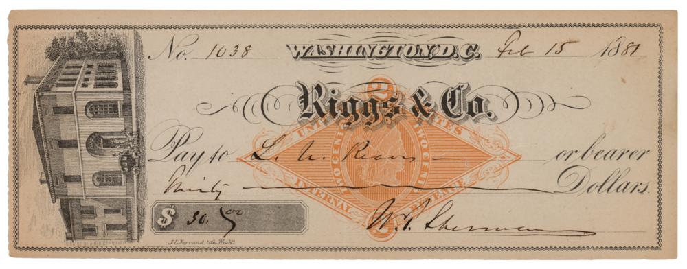 Riggs & Co. bank check, 7.5 x 2.75, filled out and signed by William T. Sherman, "W. T. Sherman," payable to L. U. Reaves for $30, February 15, 1881. In fine condition.