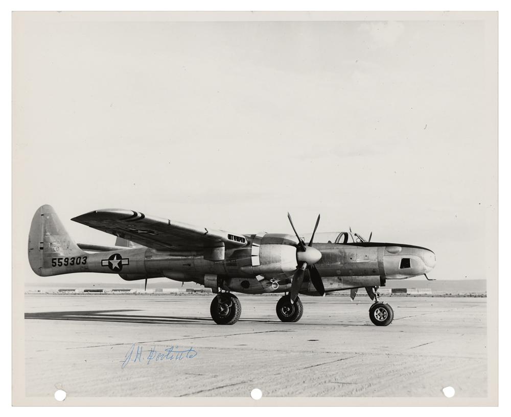 Glossy 10.5 x 8.5 photo of a United States military aircraft resting on the tarmac, signed in blue ballpoint, "J. H. Doolittle." In very good to fine condition, with scattered light creasing, and three file holes along the bottom edge, easily matted out.
