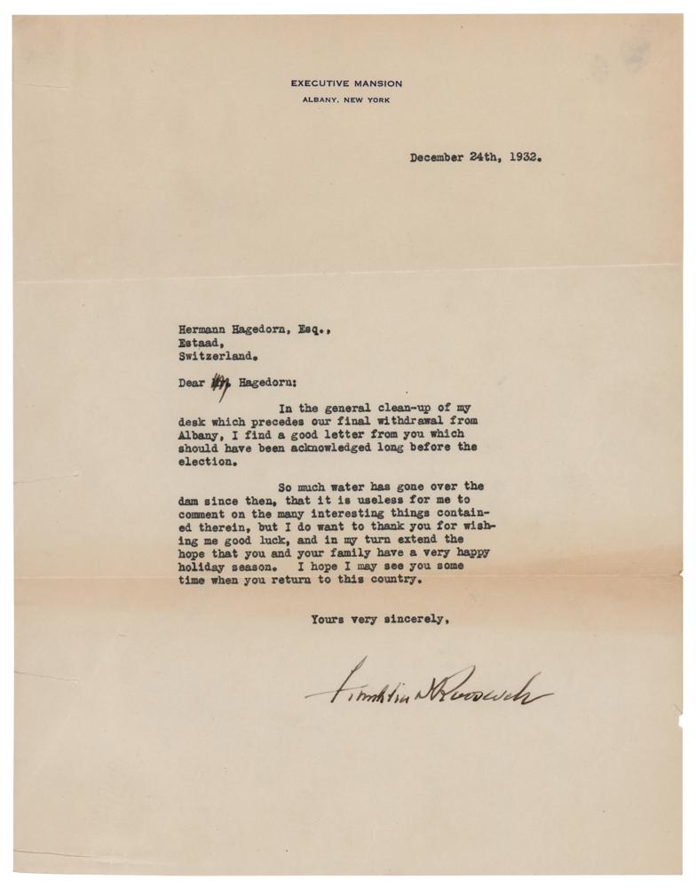 TLS as president-elect, one page, 8.5 x 11, Executive Mansion letterhead, December 24, 1932. Letter to author Hermann Hagedorn, in full: "In the general clean-up of my desk which precedes our final withdrawal from Albany, I find a good letter from you which should have been acknowledged long before the election. So much water has gone over the dam since then, that it is useless for me to comment on the many interesting things contained therein, but I do want to thank you for wishing me good luck, and in my turn extend the hope that you and your family have a very happy holiday season. I hope I may see you some time when you return to this country." In very good to fine condition, with light toning along a fold, and three tears to the left edge. A gracious letter from FDR written a week before leaving Albany for Washington, D.C. Hagedorn was an American author, poet, and Harvard instructor (1882-1964) who was also a friend and biographer of Theodore Roosevelt. He also served as Secretary and Director of the Theodore Roosevelt Association from 1919 to 1957.