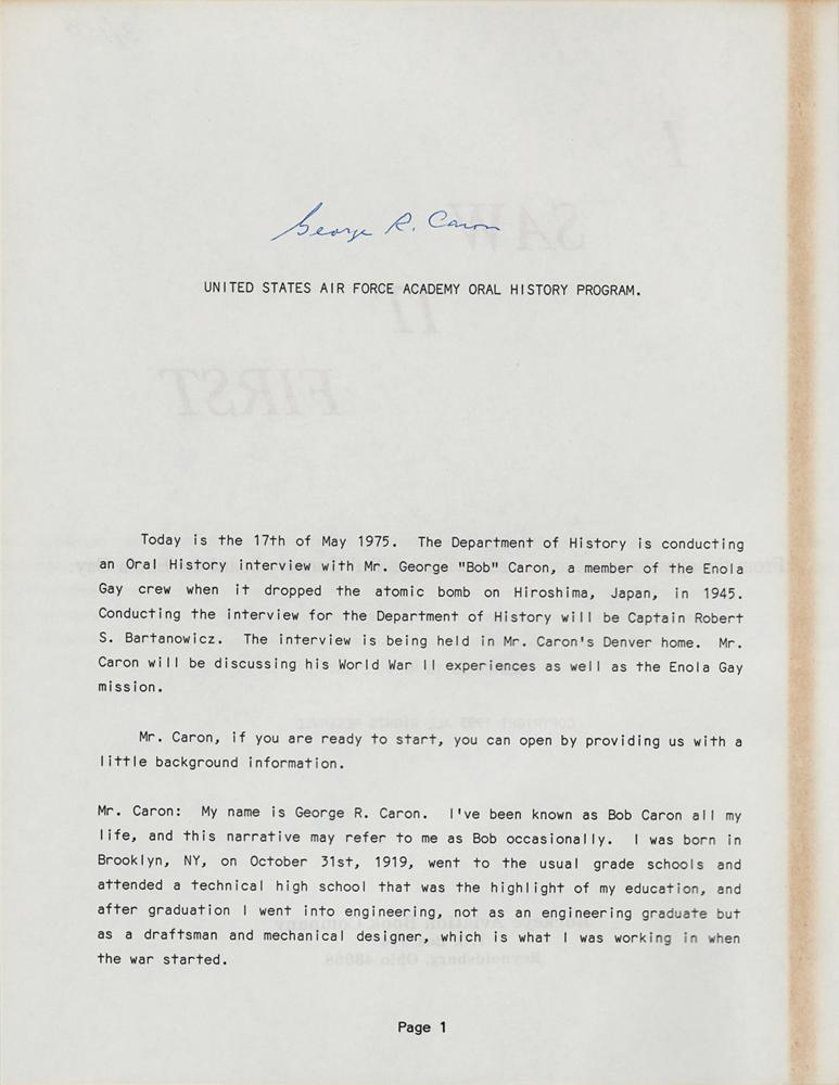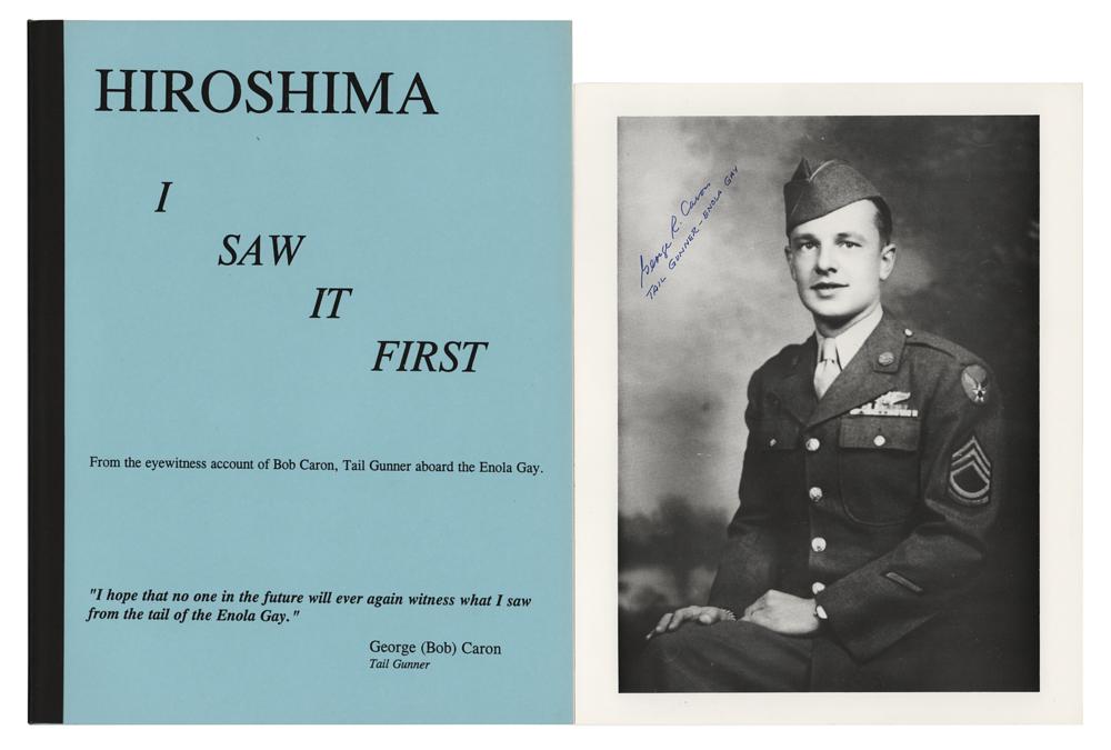 Two items: a cardstock 8 x 10 photo of Caron in uniform, signed in blue felt tip, "George R. Caron, Tail Gunner—Enola Gay"; and a limited edition paperback booklet of tailgunner George Caron's eyewitness account entitled "Hiroshima: I Saw It First," numbered 3/150, 8.5 x 11, 39 pages, signed on the first page in blue ballpoint, "George R. Caron." In fine condition.