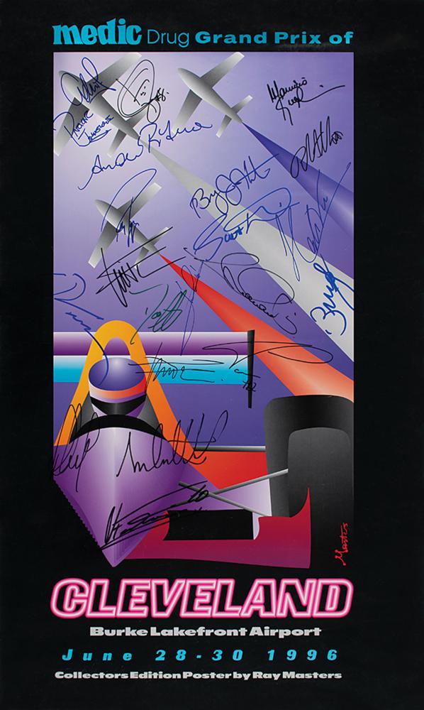 Color 18 x 30 poster for the 1996 Medic Drug Grand Prix of Cleveland, held at the Burke Lakefront Airport in Cleveland, Ohio, on June 28-30, 1996, signed in various colored felt tip by 21 notable racecar drivers, including: Mario Andretti, Michael Andretti, Kenny Bräck, Hélio Castroneves, Scott Dixon, Gil de Ferran, Adrián Fernández, Norberto Fontana, Dario Franchitti, Scott Goodyear, Robby Gordon, Maurício Gugelmin, Bryan Herta, Parker Johnstone, Bruno Junqueira, Roberto Moreno, Max Papis, André Ribeiro, Paul Tracy, Jimmy Vasser, and Alex Zanardi. Rolled and in fine condition, with some wear to borders.