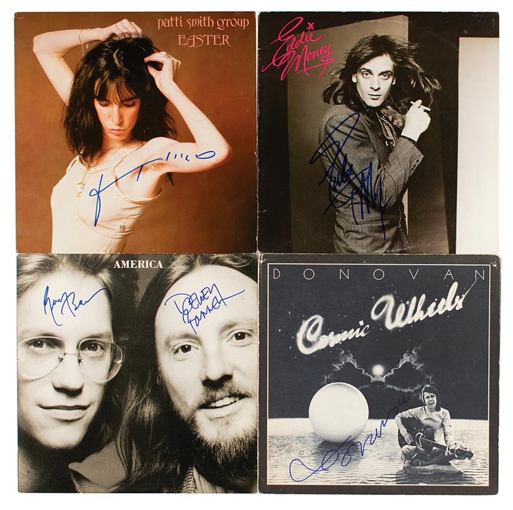 Group lot of four rock albums signed on the front cover in blue felt tip by one or more musicians, including: Silent Letter by America, signed by Gerry Beckley and Dewey Bunnell; Cosmic Wheels by Donovan, signed by Donovan; Self-titled debut album from Eddie Money, signed by Eddie Money; and Easter by the Patti Smith Group, signed by Patti Smith. In overall fine condition. The records are included.