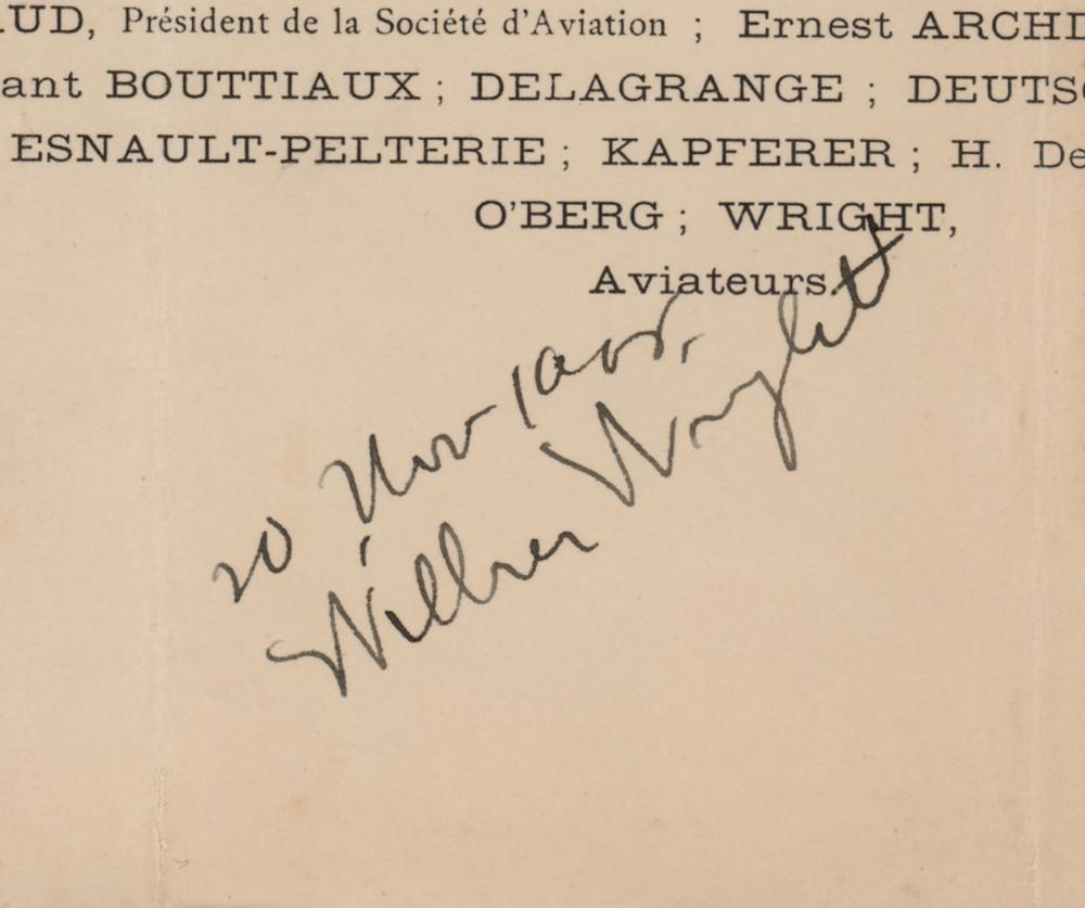 Menu created for a special "Diner de la Marmite" hosted for pioneering aviators on November 20, 1908, measuring 15.75 x 11.75 open, neatly signed at the bottom in ink, "20 Nov. 1908, Wilbur Wright." The printed text makes note of several of the attending luminaries, including Ernest Archdeacon, Louis Bleriot, Leon Delagrange, Henri Deutsch de la Meurthe, Robert Esnault-Pelterie, Henry de La Vaulx, and Wilbur Wright. In fine condition, with three vertical folds, and a small stain to the bottom edge.