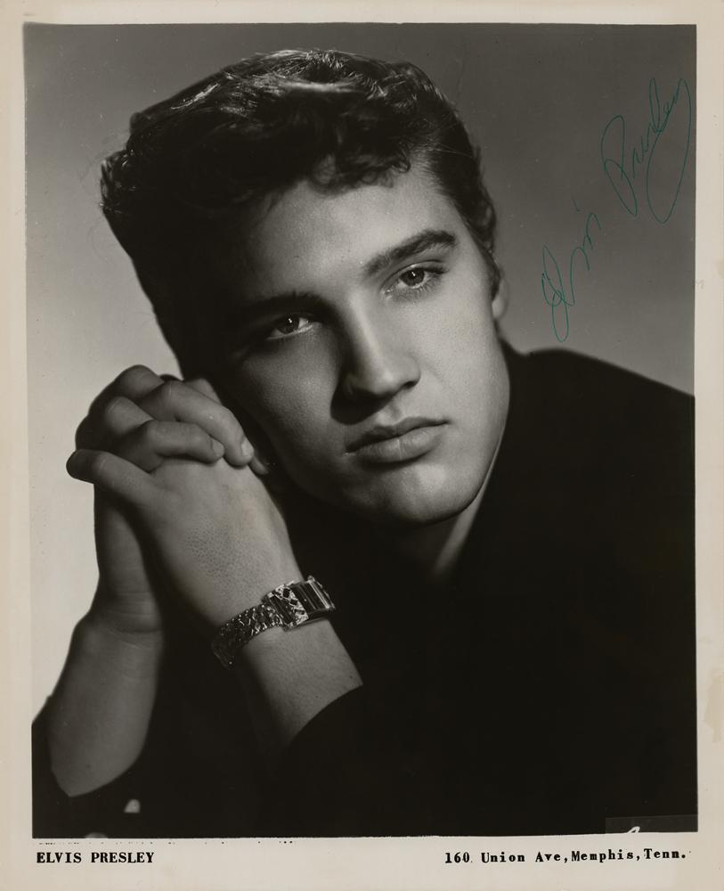 Vintage glossy 8 x 10 publicity photo of a young Elvis Presley resting his cheek on clasped hands in a handsome up-close pose, signed nicely in blue ballpoint. In fine condition, with scattered light creasing, and small surface impressions running along the left edge. A tender, desirable non-personalized portrait of the king of rock and roll early into his career.