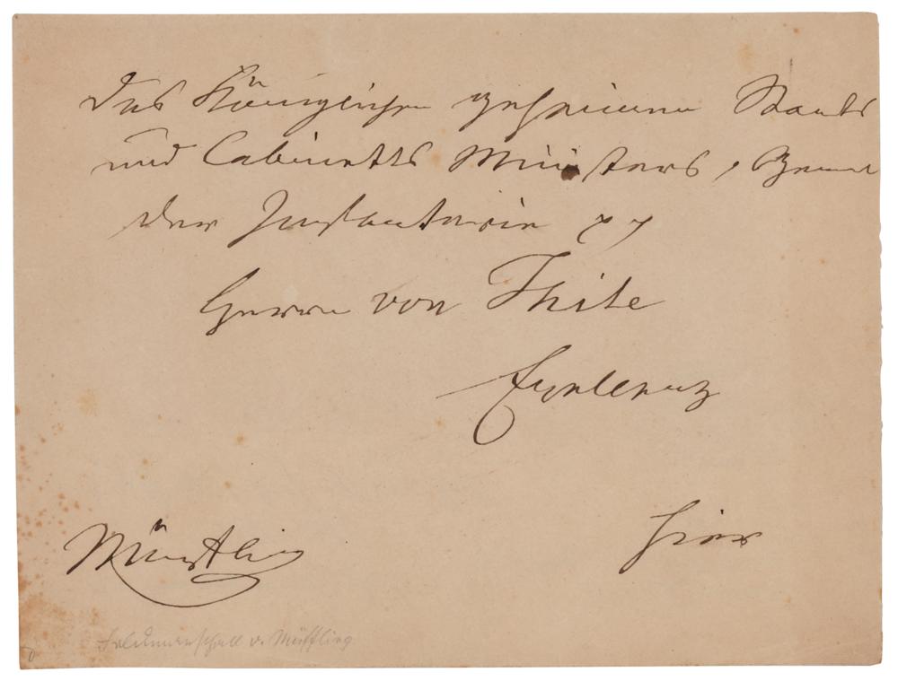 Prussian field marshal and military theorist (1775-1851) who served as Blücher's liaison officer in Wellington's headquarters during the Battle of Waterloo and was one of the organizers of the final victory over Napoleon. ANS in German, signed “Muffling,” one page, 5.75 x 4.5, no date. Untranslated handwritten note, signed in the lower left corner by Muffling. In fine condition, with minor foxing to lower left corner.