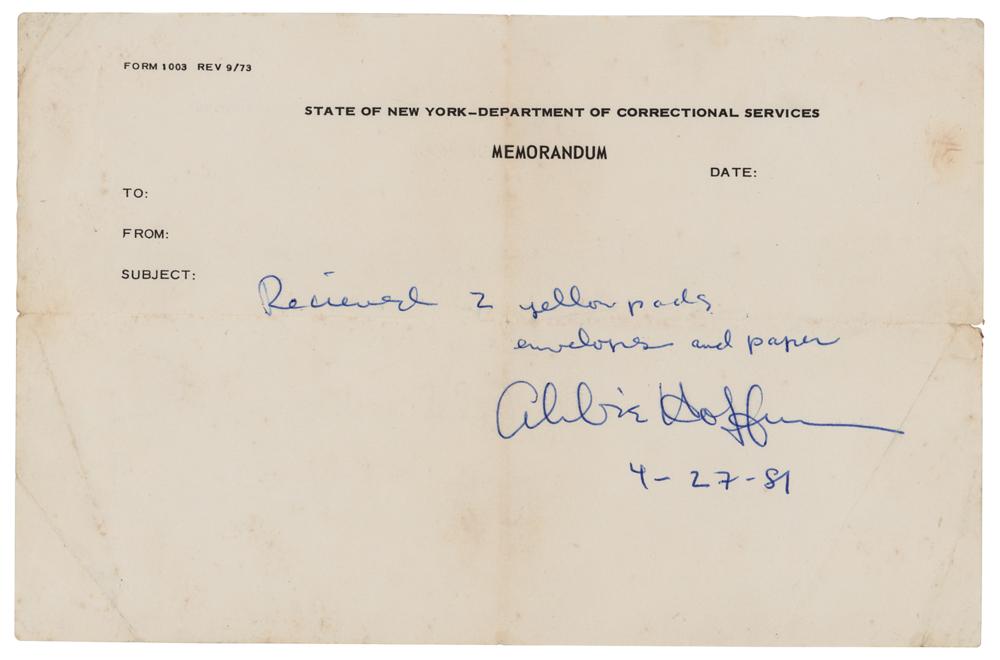 DS, one page, 8.5 x 5.5, April 27, 1981. Memorandum from New York's Department of Correctional Services, which reads: "Received 2 yellow pads, envelopes and paper." Signed below in blue ballpoint by Abbie Hoffman, who adds the date. In very good to fine condition, with light soiling and creasing, and a very short split to the end of the horizontal fold.