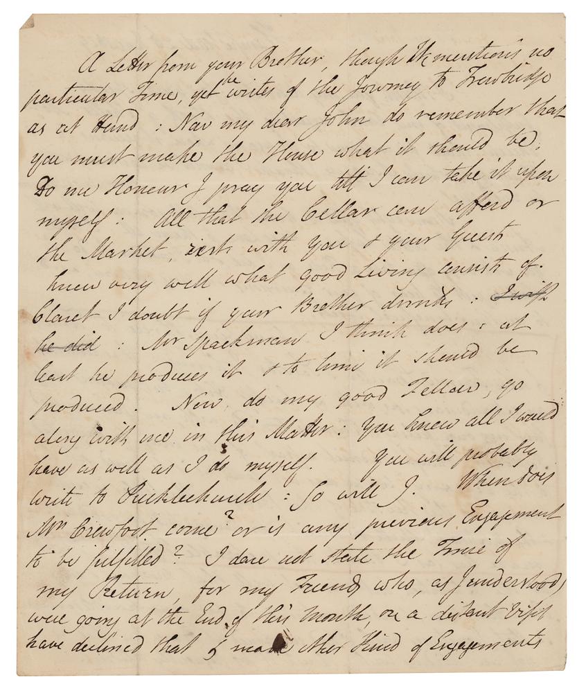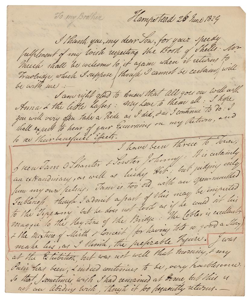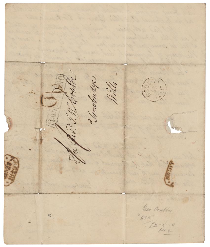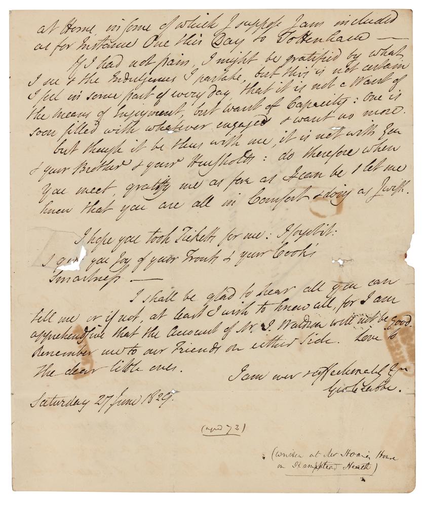 English poet, surgeon, and clergyman (1754-1832) known for his early use of the realistic narrative form and his descriptions of middle and working-class life and people. ALS signed “Geo. Crabbe,” three pages on two adjoining sheets, 7.25 x 9, June 27, 1829. Handwritten letter to Rev. J. W. Crabbe, evidently referring to James Thom's statues of characters from the poem 'Tam o' Shanter' by Robert Burns. In part: "I have been to Town, & seen Tam o' Shanter and Souter Johnny: It is certainly an extraordinary, as well as lucky Hit: but judging only from my own feeling, Tam is too old, with an open-mouthed Feebleness?he does not look as if he could sit his Maggie to the Keystone of the Bridge: The Cobbler is excellent, & the mixture or Mirth & Conceit (for having told so good a story) make his, as I think, the preferable Figure." In fine condition.