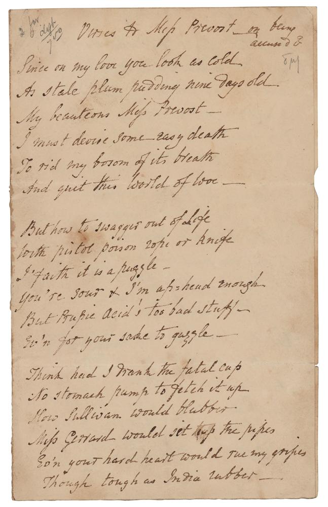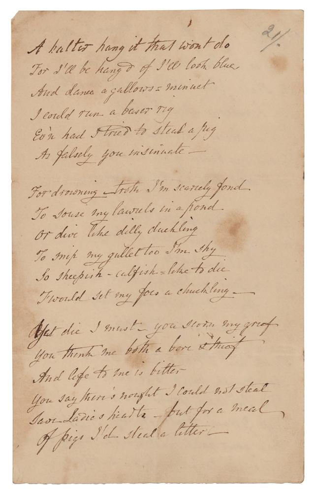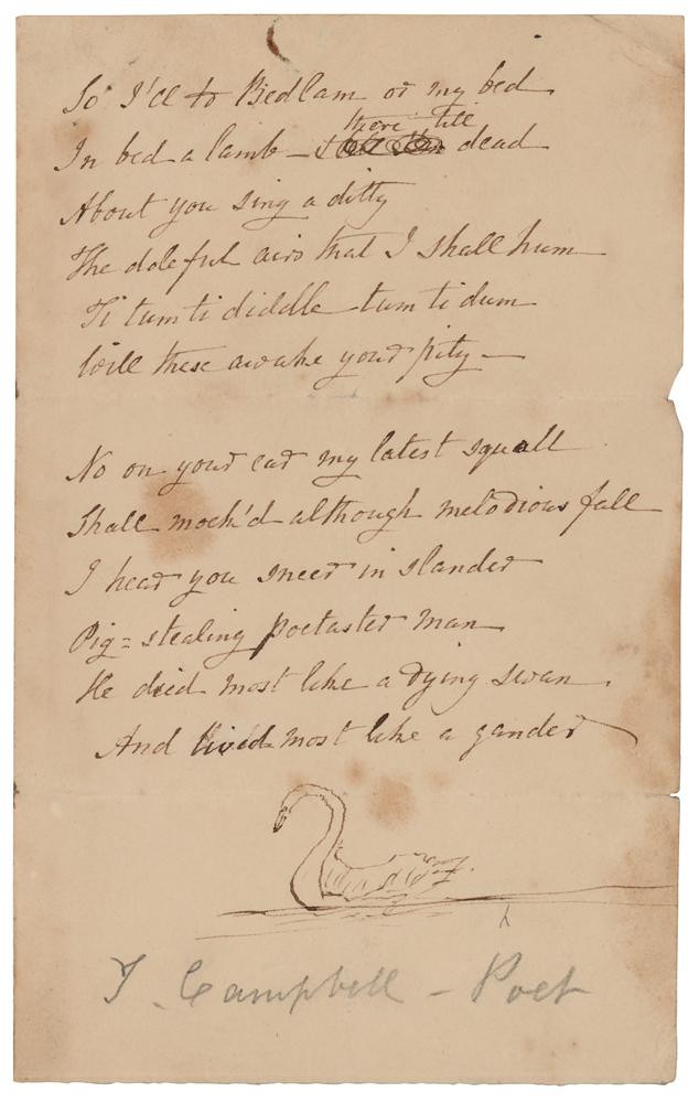 Eminent Scottish poet (1777-1844) remembered for his didactic poem 'The Pleasures of Hope' and for his patriotic war songs. Unsigned handwritten poem by Thomas Campbell, three pages on two sheets, 4.5 x 7.25, no date. Campbell writes out a poem, headed: "Verses to Miss Prevost on being Accused." The poem concludes: "I hear you sneer in slander / Pig-stealing poetaster man / He died most like a dying swan / And lived most like a gander." Campbell sketches a swan at the conclusion. In very good to fine condition, with some scattered staining and a rusty circular paperclip impression to the top.