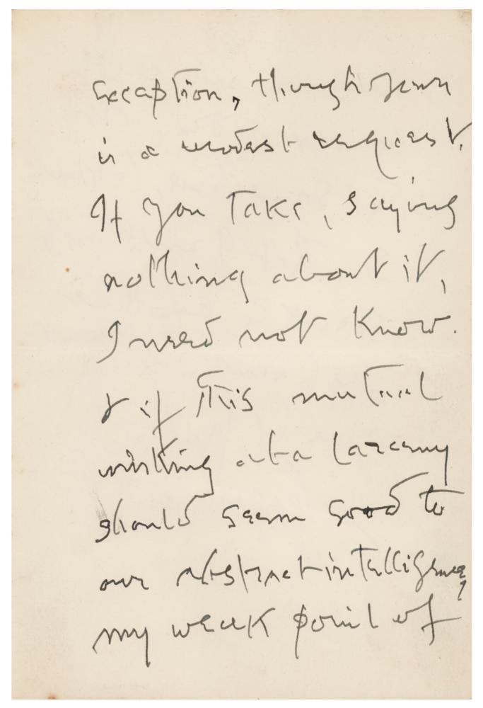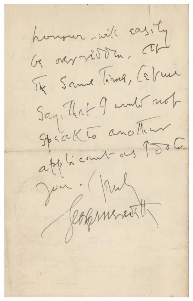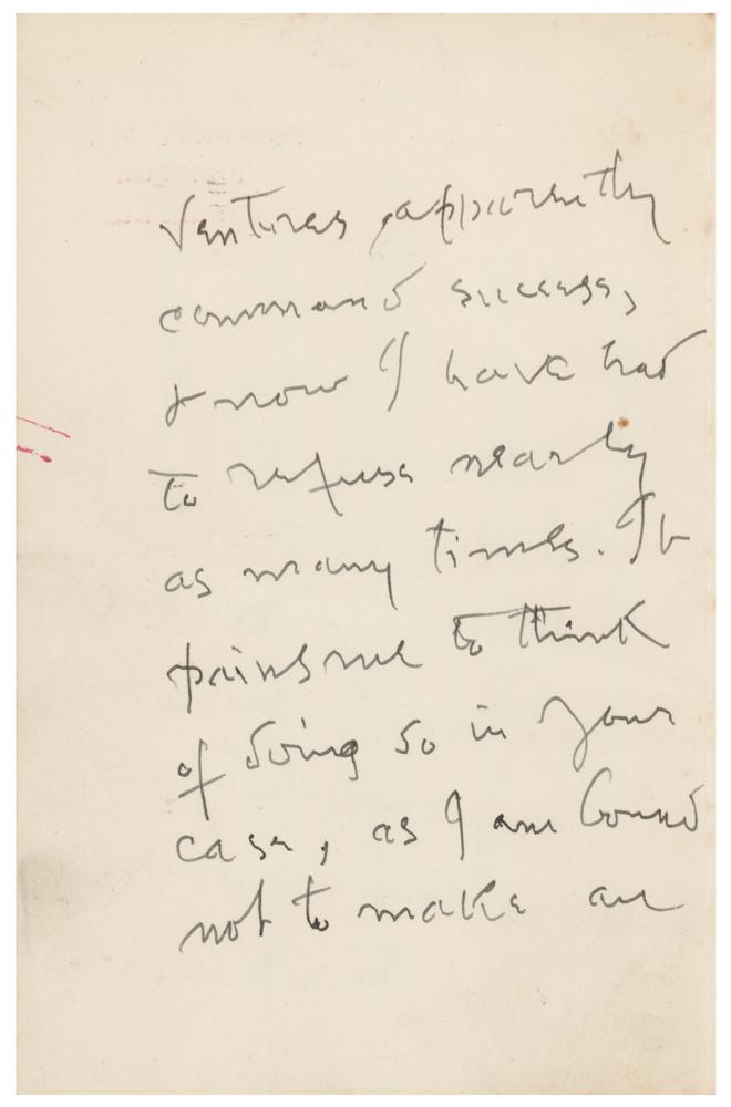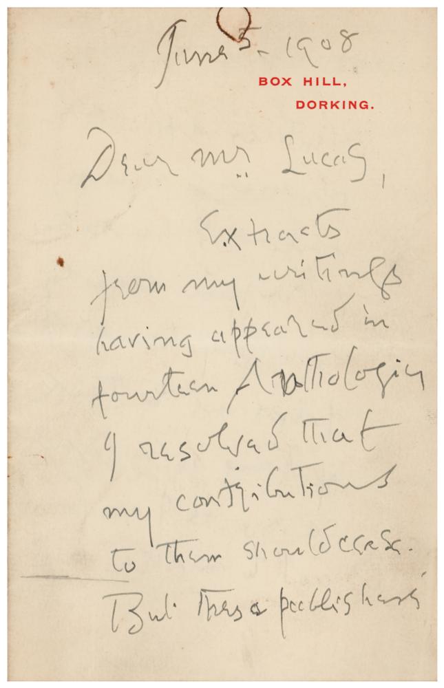 Influential English novelist and poet of the Victorian era (1828-1909) whose innovative novels—like The Ordeal of Richard Feverel, The Egoist, and Diana of the Crossways—paid close attention to their characters' psychology and took an interest in social change. ALS, four pages on two adjoining sheets, 4.5 x 7, Box Hill letterhead, June 5, 1908. Handwritten letter regarding the publication of his work, in part: "Extracts from my writings having appeared in fourteen Anthologies I resolved that my contributions to them should cease. But these publishers ventures, apparently command success, & now I have had to refuse nearly as many times. It pains me to think of suing so in your case, as I am bound not to make an exception?If you take, saying nothing about it, I need not know." In fine condition, with a rusty circular paperclip impression to the top.