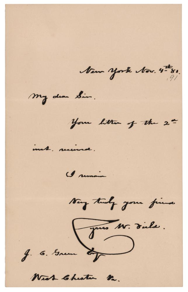 American industrialist (1819-1892) who financed the first permanently operational transatlantic telegraph cable. ALS, one page, 5 x 8, November 4, 1891. Handwritten letter to J. C. Green in Pennsylvania, in full: "Your letter of the 2d inst. received." In fine condition. Accompanied by the original mailing envelope.